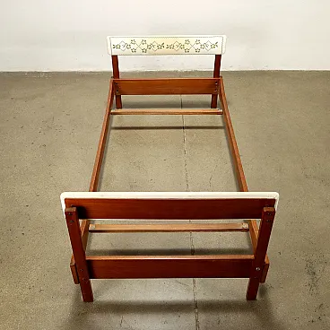 Letto singolo in teak con testiera e pediera imbottite e rivestite in tessuto, anni '60