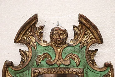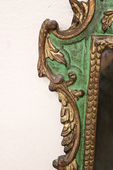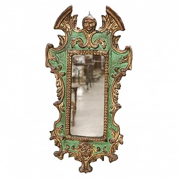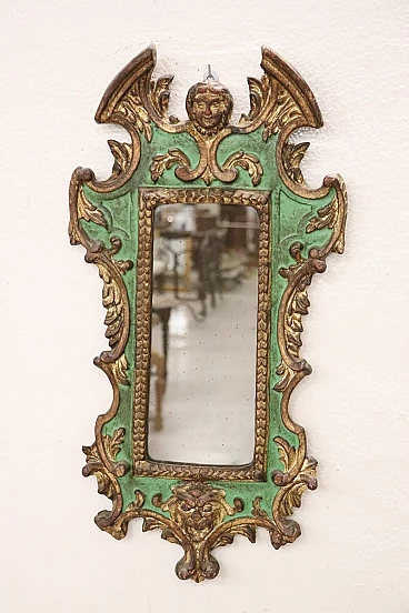 Specchio da parete in legno di pioppo intagliato del XX secolo, seconda metà. La cornice è caratterizzata da un’elaborata decorazione di gusto gotico. Il legno è laccato nei toni del verde con eleganti decorazioni dorate, da notare le teste intagliate nel legno. Lo specchio antichizzato presenta piccole imperfezioni. Elegante in ogni stanza della vostra casa. Prezzo trattabile potete inviarci le vostre proposte di acquisto le valuteremo con piacere vi invitiamo ad inviarci le vostre proposte di acquisto le valuteremo con piacere.