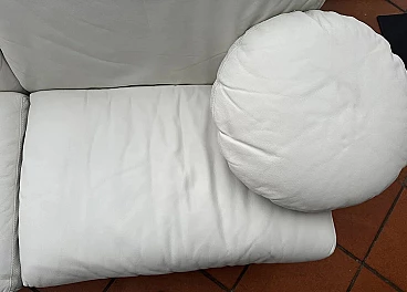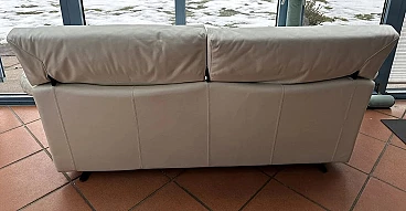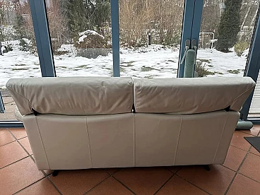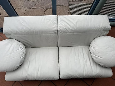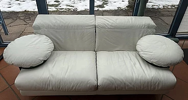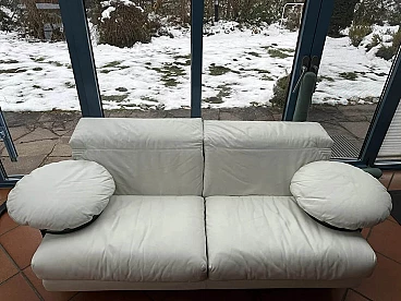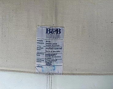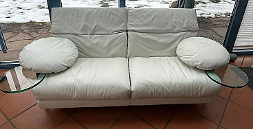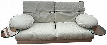 Divano Arca con tavolini in vetro estraibili di Paolo Piva per B&B Italia, anni '80. Ottimo stato, minimi segni di utilizzo. Divano dalla comoda ergonomia, rivestito con una raffinata e morbida pelle di concia toscana Maxalto bianca. Modello dal design moderno disegnato dal grande architetto Paolo Piva negli anni '80, discretamente voluminoso in una lussuosa e spessa pelle con cuscini ben imbottiti. Linea leggera nell'aspetto grazie ai piedi e alla struttura relativamente sottile in metallo verniciato a polveri epossiliche in nero. Modello di divano molto particolare a 2,5 comodi posti, dotato di due tavolini rotondi in cristallo trasparente a filo lucido che fuoriescono da sotto i braccioli. I cuscini possono essere rimossi per facilitare la pulizia e la perfetta manutenzione. I braccioli e i poggiatesta sono completamente regolabili. Proviene da una casa delle vacanze, ora è in magazzino. Altezza della seduta: 45 cm.