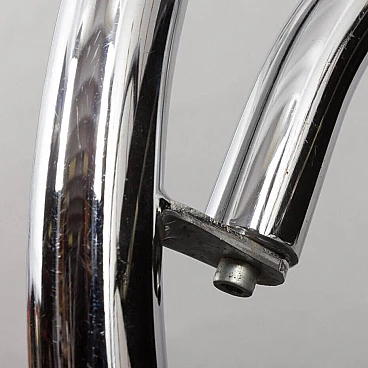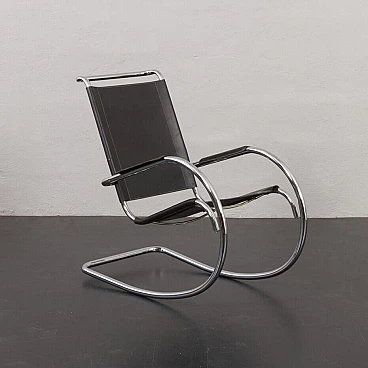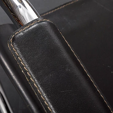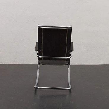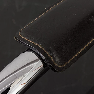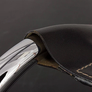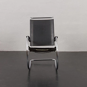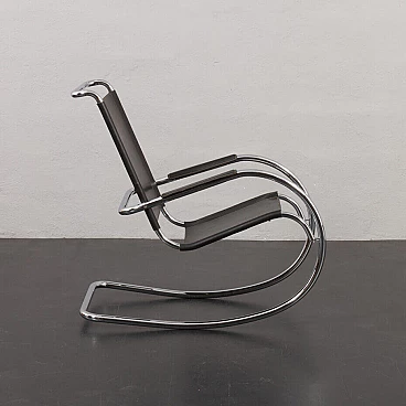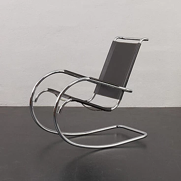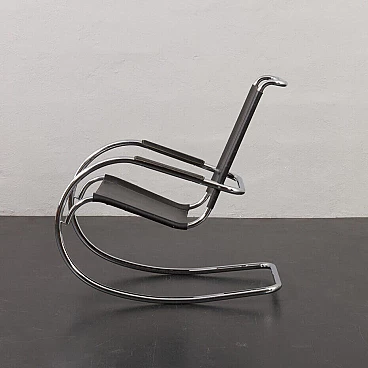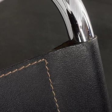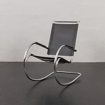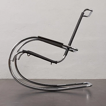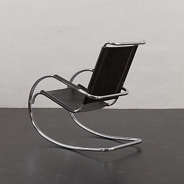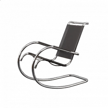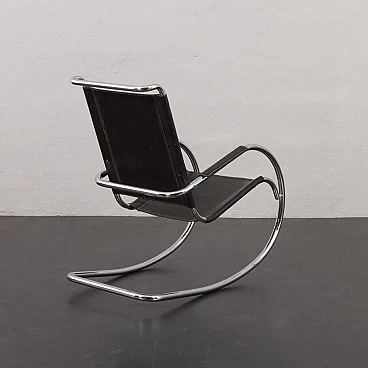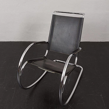 Incorporando i principi dell'iconico movimento Bauhaus, questa sedia a dondolo italiana realizzata negli anni '70 da Fasem incarna un design elegante e minimalista. Questo perfetto connubio tra forma e funzione ricorda i progetti del famoso architetto e designer Ludwig Mies van der Rohe. Le linee pulite e la forma ergonomica della sedia offrono il massimo comfort e sostegno, consentendo di rilassarsi e distendersi. Il rivestimento in pelle nera aggiunge un tocco di lusso. La fusione di funzionalità e stile è evidente nel design accurato, che rende questo pezzo una dichiarazione davvero eccezionale in qualsiasi spazio abitativo contemporaneo o moderno. La sedia è in ottime condizioni originali vintage. Lasciamo piccoli e naturali segni d'uso che non rovinano l'estetica e confermano solo l'originalità. La riportiamo al suo aspetto migliore, considerando che ha 60 anni. Altezza del sedile: 46 cm, altezza bracciolo: 62 cm.
