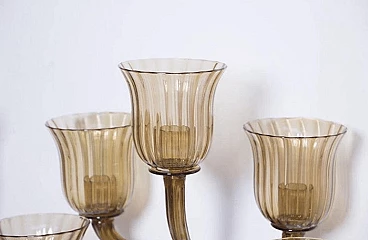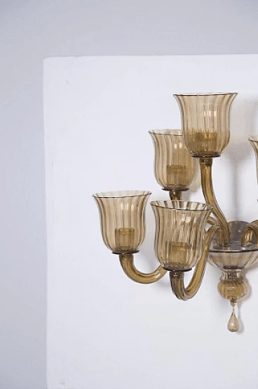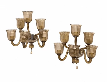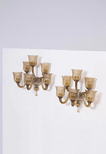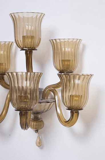 Entra nel raffinato mondo dell'eleganza degli anni '50 con questa coppia di applique in vetro ambrato realizzata dalla rinomata Venini, un nome sinonimo di arte senza tempo. Queste applique non sono semplici apparecchi ma una celebrazione dell'artigianato e del design che trascende le epoche. Ogni applique è un capolavoro di cristallo ambrato, lavorato meticolosamente alla perfezione. La tecnica del rigadin utilizzata per la loro creazione conferisce un tocco di raffinatezza classica a questi tesori luminosi. Il vetro, testimonianza dell'impegno di Venini per l'eccellenza, è ornato da delicati riccioli e da un pendente, accuratamente realizzati a mano dai maestri vetrai della prestigiosa manifattura Venini. La struttura in acciaio che sostiene queste applique non è un semplice supporto ma un simbolo di forza e durata. Incornicia il delicato vetro con sobria eleganza, lasciando che l'arte del vetro Venini sia al centro della scena. La scelta dell'acciaio garantisce che queste applique resistano alla prova del tempo, proprio come il loro design. Ogni lampada vanta tre luci, i cui supporti assomigliano a lanterne che proiettano un bagliore caldo e invitante. Queste applique, grazie alle loro dimensioni e al loro design, sono perfette per illuminare corridoi o per abbellire grandi ingressi in stile classico. Non si limitano a fornire luce ma creano un'atmosfera, un senso di opulenza e raffinatezza che ti trasporta in un mondo di bellezza senza tempo. Mentre ti crogioli nel caldo e incantevole bagliore di queste applique Venini non potrai fare a meno di apprezzare la maestria e l'attenzione ai dettagli che hanno portato alla loro creazione.