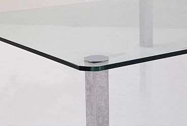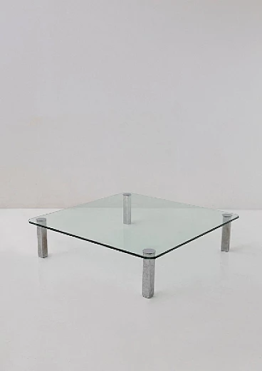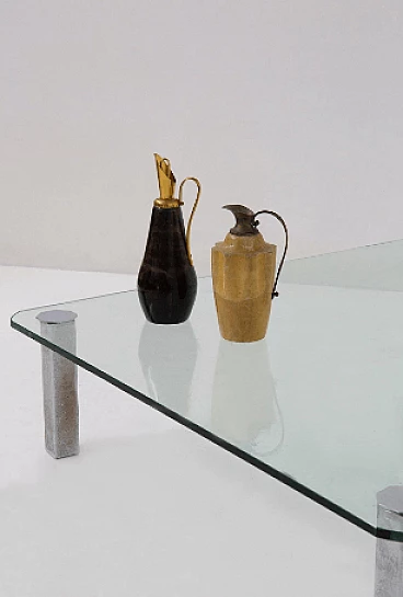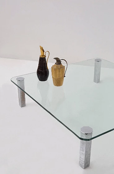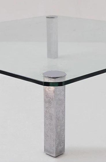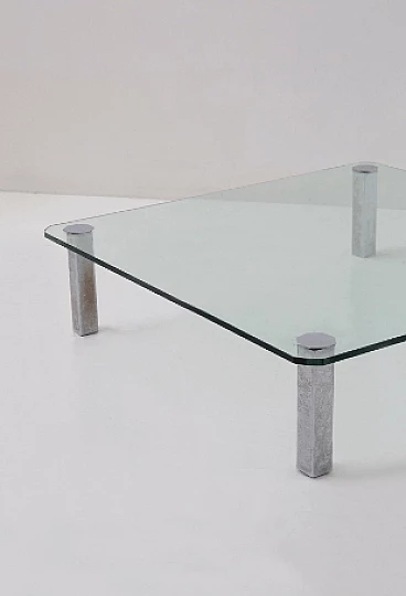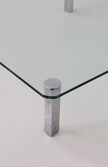Nella vibrante era degli anni '70, il design italiano era al suo apice e da quel calderone creativo emerse questo gioiello di tavolino. Con il suo design minimalista e modernista, racchiude l'essenza di quell'epoca, fondendo forma e funzione in perfetta armonia. Quattro gambe in acciaio, modellate ciascuna in un perfetto parallelepipedo, si ergono a custodi di stile e innovazione. Tuttavia, ciò che distingue questo tavolo è il suo design ingegnoso. Le quattro gambe si svitano con grazia dai bulloni esagonali superiori, consentendo al piano in vetro di inserirsi perfettamente in posizione. È come se il tavolino si assemblasse da solo, a testimonianza della meticolosa lavorazione artigianale che ha portato alla sua creazione. La superficie è un quadrato di vetro trasparente, i suoi bordi si rastremano delicatamente per un tocco di raffinatezza. Mentre la luce danza sul vetro, crea un'atmosfera eterea, proiettando intricati motivi e riflessi che cambiano con il passare della giornata. È una tela per la tua immaginazione, pronta a contenere i tesori del tuo spazio vitale. Con le sue linee pulite e la precisione geometrica, questo tavolino non è limitato da nessuno stile. Si fonde facilmente con qualsiasi arredamento, un camaleonte di design che si abbina sia al contemporaneo che al classico. È un pezzo versatile, pronto ad elevare qualsiasi stanza. Tuttavia, la sua vera essenza risiede nelle sue radici, saldamente radicate nel movimento modernista degli anni '70. È una testimonianza vivente dello spirito di quell'epoca, una celebrazione del design audace e un allontanamento dall'ornato. Non si evidenziano danni ma solo usura nei piedini che sono da lucidare e leggeri graffi.