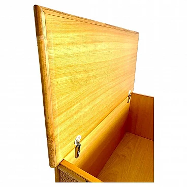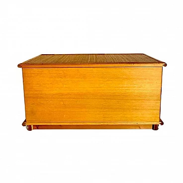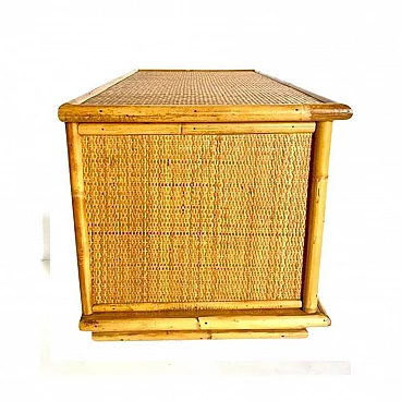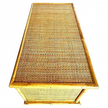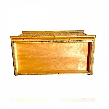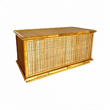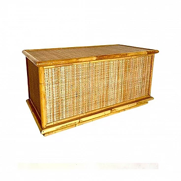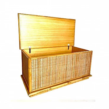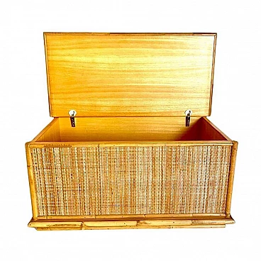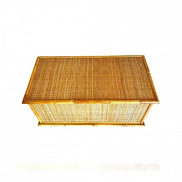 Rara e bellissima cassapanca vintage in rattan e bambù prodotta da "Dal Vera", Italia, negli anni '70. Struttura principale in legno di faggio rivestita di raffinato rattan e bambù. L'oggetto è stato lucidato e la superficie è stata rifinita. In ottime condizioni, con solo qualche segno del tempo. Etichetta originale incollata nella parte interna della cassapanca. Visitate la pagina del nostro profilo qui per controllare la nostra collezione di oltre 200 pezzi originali d'epoca (e tutti completamente restaurati) in continuo aggiornamento. Significativo risparmio sulle spese di spedizione per acquisti multipli.
