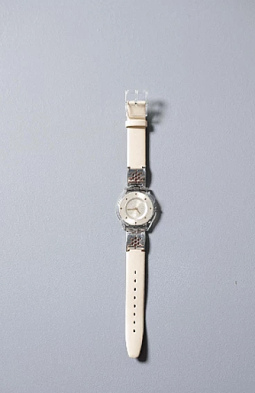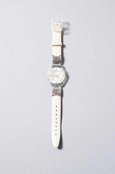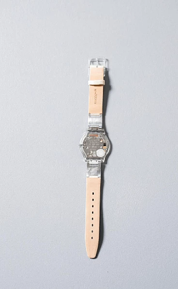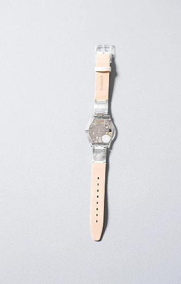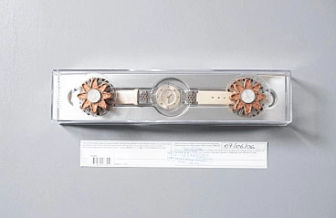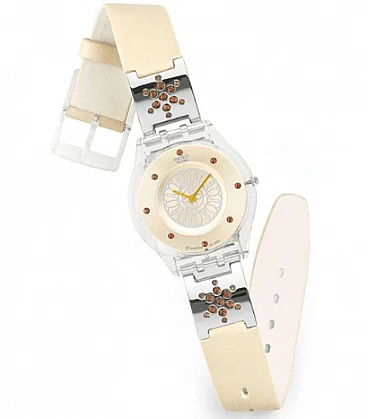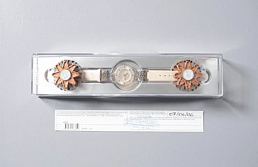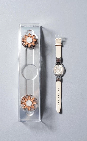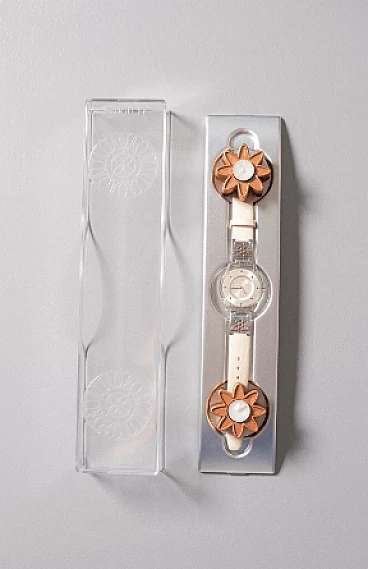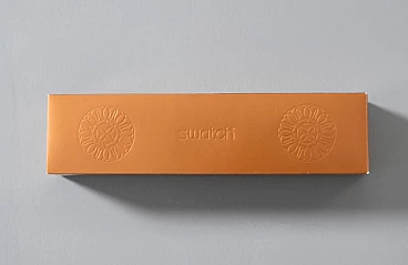 Orologio Swatch Skin Flower Wishes SFK265, 2006. Nel regno dell'eleganza cronometrica, esiste questa meraviglia di orologio, un gioiello radioso della serie di orologi più sottili al mondo. Non si limita a segnare i momenti del tempo ma racchiude una sinfonia di bellezza e grazia. Questo Swatch non è un semplice orologio ma una celebrazione della Festa della Mamma, un'edizione speciale confezionata in un'elegante scatola di plastica. All'interno di questa scatola, due portacandele a forma di fiore cullano graziosamente il cinturino dell'orologio, aggiungendo un ulteriore tocco di incanto a un'esperienza già magica. Possedere questo orologio è come possedere un'opera d'arte, che ricorda che bellezza e funzionalità possono coesistere armoniosamente. È una testimonianza della maestria e della creatività per cui Swatch è nota da tempo. Il quadrante bianco crema, ornato da delicati motivi e da eleganti strass marroni, ti porta in un mondo di raffinatezza. La sua semplicità è la sua forza, una tela di sobria bellezza che cattura l'essenza di uno stile senza tempo. Ogni sguardo a questo quadrante è come un'opera d'arte. L'abbinamento con il beige, testimonianza di maestria artigianale, lo rende più di un semplice cinturino, è una dichiarazione. Avvolge il polso con un abbraccio rassicurante e si chiude in modo sicuro grazie a una robusta chiusura in plastica trasparente. Non si tratta di un semplice orologio ma di un gioiello, un ornamento che eleva il tuo ensemble a un nuovo livello di raffinatezza. Il cinturino, con le sue delicate maglie in metallo, è una costellazione di pietre marroni scintillanti disposte a stella. È come se l'orologio stesso portasse al polso la brillantezza del cielo notturno. L'involucro, elegantemente trasparente, aggiunge un elemento di sorpresa e di intrigo, rivelando il funzionamento interno di questo capolavoro del cronometraggio. Ma non si tratta solo di estetica, questo orologio è anche uno strumento di precisione: vanta un accurato movimento ETA che garantisce non solo un aspetto squisito, ma anche un'ora perfetta. È una fusione di forma e funzione, un'unione perfetta di stile e sostanza. Dimensioni della confezione: 28 x 12 x 5 cm.