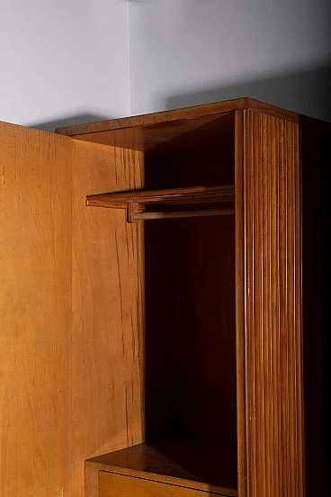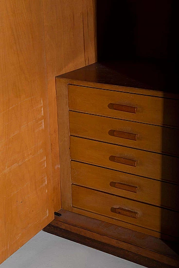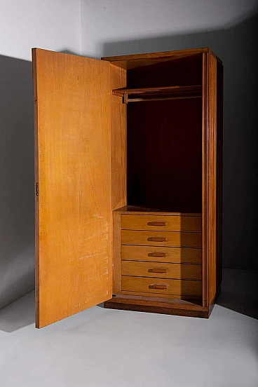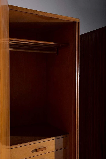 Nell'incantevole epoca degli anni '50, l'artigianato italiano raggiunse il suo apice e gli armadi grissinati di Fabbrica Mobili e Armadi Triestina, attribuiti alle abili mani di Luigi Scremin, sono una testimonianza senza tempo di quel periodo glorioso. Questi squisiti armadi, proposti in coppia ma altrettanto incantevoli se considerati singolarmente, incarnano l'epitome della raffinatezza e dell'eleganza nel design del mobile. La prima cosa che cattura l'attenzione è l'intricata lavorazione grissinata perimetrale, una tecnica magistrale di lavorazione del legno che abbellisce l'intero esterno. Questi dettagli ornamentali non solo conferiscono un senso di opulenza, ma creano anche un'unità visiva armoniosa in tutto il pezzo. È una testimonianza della maestria e della meticolosità artigianale dell'epoca. Ogni mobile, un capolavoro dell'arredamento italiano, è dotato di un'anta con chiave in ottone. Quando lo si apre, si apre un mondo di artigianato. Nella parte superiore, un ripiano in legno funge da raffinato appendiabiti e portapantaloni, testimonianza di funzionalità ed estetica. La lavorazione del legno qui esposta è a dir poco mozzafiato, una vera e propria vetrina dell'artigianato. In fondo a questi eleganti armadi, quello di destra vanta cinque cassetti in legno meticolosamente lavorati, a testimonianza della loro qualità e utilità. Nel mobile di sinistra si trova un unico cassetto, che però porta con sé un'aria di unicità ed esclusività. Ogni cassetto è un'opera d'arte in sé, che dimostra la maestria degli artigiani che lo hanno creato.