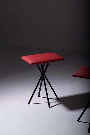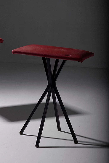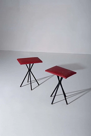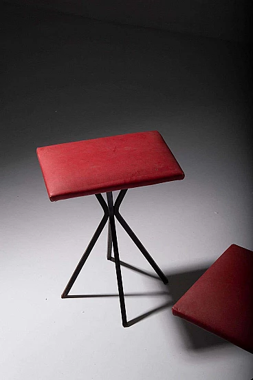 Questa coppia di sgabelli vintage degli anni '60 rappresenta un'autentica gemma nel mondo del design italiano, un prodotto dell'artigianato di un'epoca d'oro. Questi sgabelli racchiudono l'essenza stessa del minimalismo unito all'originalità. La seduta di questi sgabelli si distingue per la sua lineare semplicità, enfatizzata dalla vibrante tonalità rossa dell'ecopelle. Questo rosso sorprendente cattura immediatamente l'attenzione, infondendo un senso di vitalità e passione in ogni ambiente in cui si trovano. Tuttavia, è nel design intrigante delle quattro gambe di ogni sgabello che risiede il loro fascino unico. Con forme che giocano con le illusioni ottiche, queste gambe convergono elegantemente verso un punto quasi centrale prima di allargarsi nuovamente alla base. Questo design non solo crea un affascinante effetto visivo, ma conferisce anche stabilità e durata agli sgabelli. Questi sgabelli sono in condizioni originali d'epoca e conservano il loro carattere autentico. I leggeri graffi e la leggera usura, che testimoniano il loro passato e il passare del tempo, ne accrescono il fascino anziché sminuirlo. Vale la pena notare con orgoglio che non ci sono strappi nel tessuto, preservandone l'integrità. In sintesi, questa coppia di sgabelli vintage italiani in ecopelle rossa è molto più di un semplice complemento d'arredo. Rappresentano un frammento di storia, un tocco di eleganza vintage capace di trasformare qualsiasi spazio in un'oasi di stile e originalità. Con il loro design minimalista e un tocco di unicità, questi sgabelli sono pronti a catturare il cuore di chi cerca un tocco di classe nel proprio ambiente.