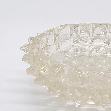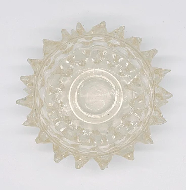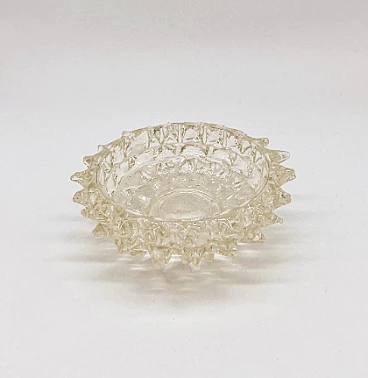 Ciotolina in vetro di Murano rostrato trasparente di Seguso, anni '50. Il vetro rostrato è un particolare design degli anni '30 frutto di Ercole Barovier, allora proprietario e designer dell'omonimo marchio Barovier & Toso, con sede nell'isola di Murano. Il marchio è ancora attivo e produce e vende ancora, tra gli altri, oggetti in vetro rostrato, dimostrando che il design è davvero senza tempo. Realizzati in vetro trasparente "cristallo" e caratterizzati da punte (rostri) che sporgono dalla superficie, i pezzi sono chiaramente artigianali. La loro bellezza risiede nelle piccole differenze tra ogni punta, che gli conferiscono un tocco irregolare, in qualche modo "wabi-sabi". Questa ciotola, prodotta probabilmente intorno agli anni '50-primi anni '60, è conservata in discrete condizioni: alcune punte sono leggermente scheggiate ma il danno è praticamente impossibile da notare a occhio nudo; l'unico modo per individuare le punte scheggiate è toccarle tutte una per una.