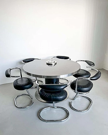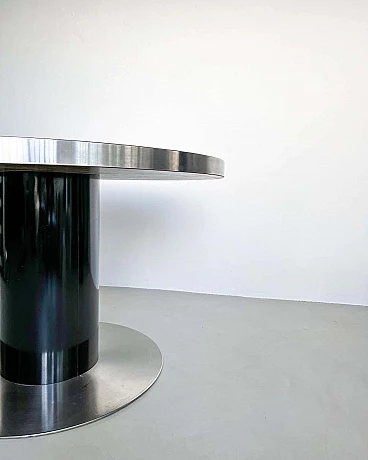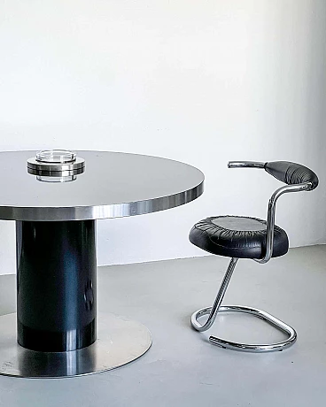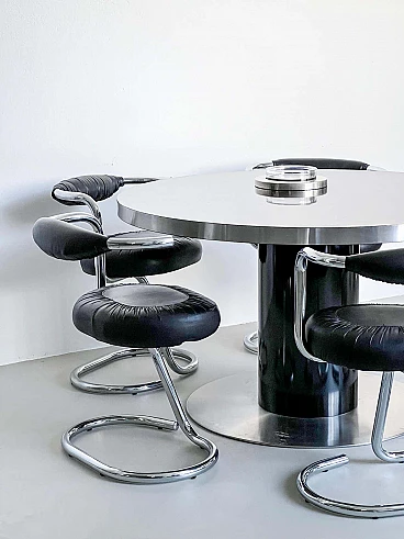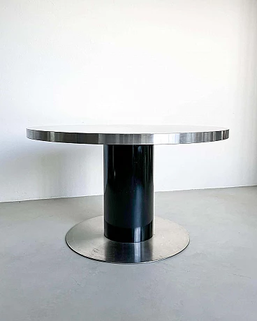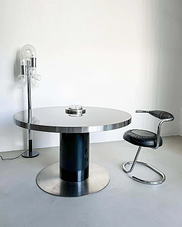 Da quel momento in poi, ha raddoppiato la sua attività di fotografo e designer di mobili, creando molti pezzi diversi, tutti accomunati dal target: ricchi jet-setter alla ricerca dell'ultima tendenza in ogni aspetto della vita. Il presente tavolo, un progetto originale dei primi anni Settanta, è ben conservato e assolutamente rappresentativo dello stile di Rizzo. Con un diametro di 130 cm, può ospitare comodamente fino a sei persone. Realizzato con linee essenziali ma decise, è in grado di polarizzare l'attenzione in qualsiasi ambiente in cui verrà collocato.