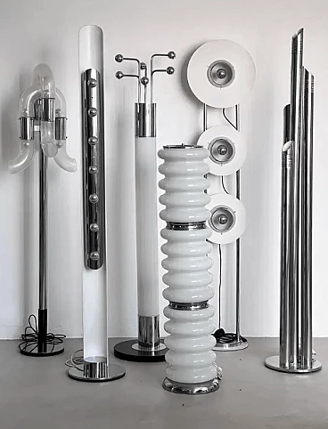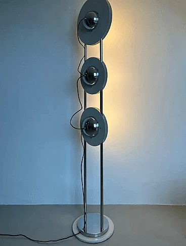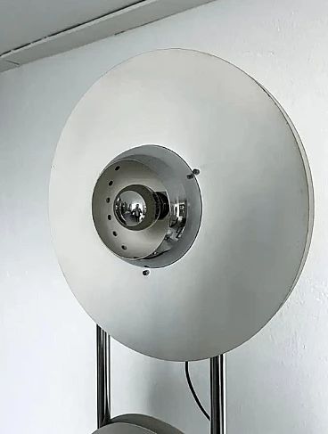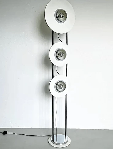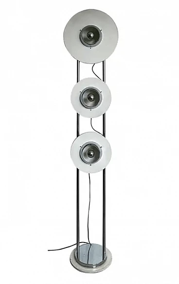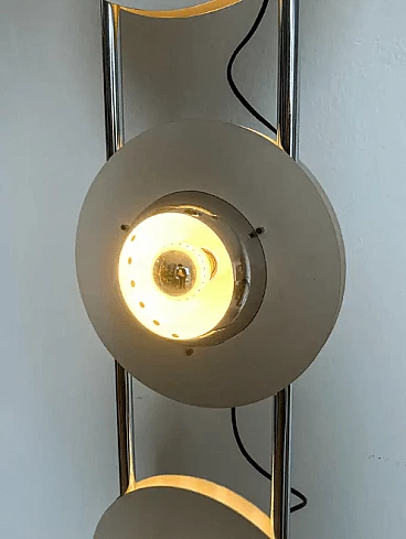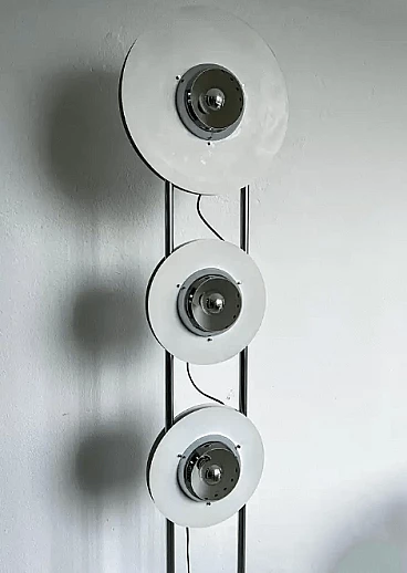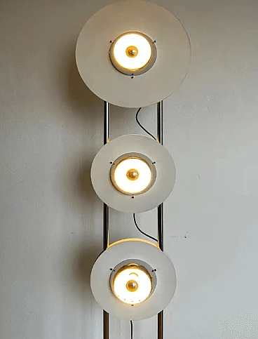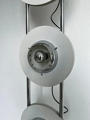 Il presente pezzo è realizzato in metallo cromato e acciaio, con tre luci simili a piattini volanti di diverse dimensioni appese a una struttura verticale. Le tre coppe cromate al centro dei dischi sono estremamente simili a componenti presenti sulle lampade Reggiani; e anche se la presente non ha etichette né timbri, è certamente realizzata nello stile, se non dallo stesso Reggiani. L'apparecchio è conservato in ottime condizioni originali, mostrando solo lievi sbiadimenti e la prevedibile patina degli anni; l'unica parte sostituita è il cablaggio, e il lavoro è stato eseguito di recente da un elettricista certificato.