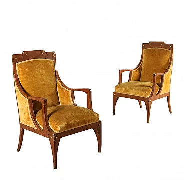Coppia di poltrone; imbottitura a molle, rivestimento in velluto, legno di rovere tinto, impreziosite da intarsi in ottone e madreperla. Altezza seduta 45 cm.