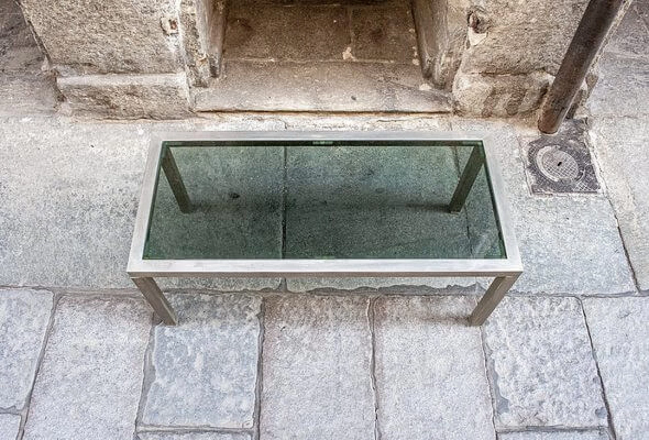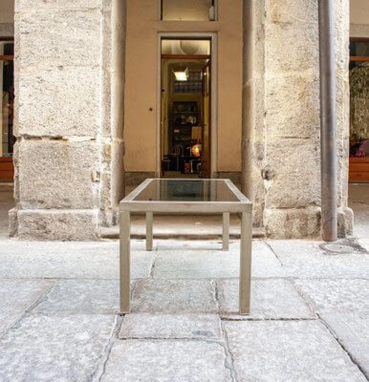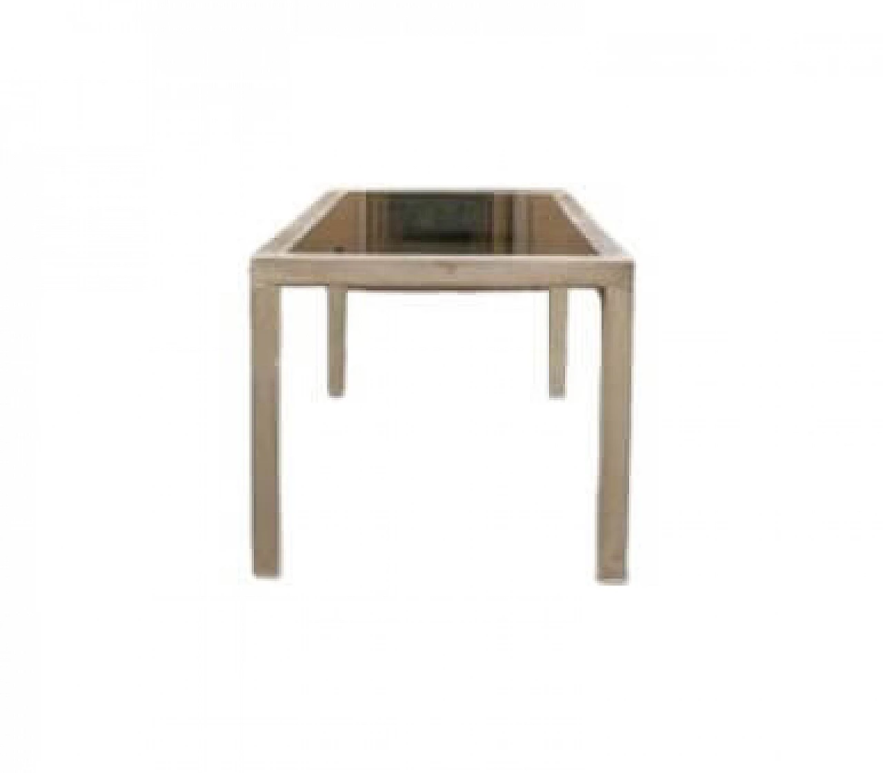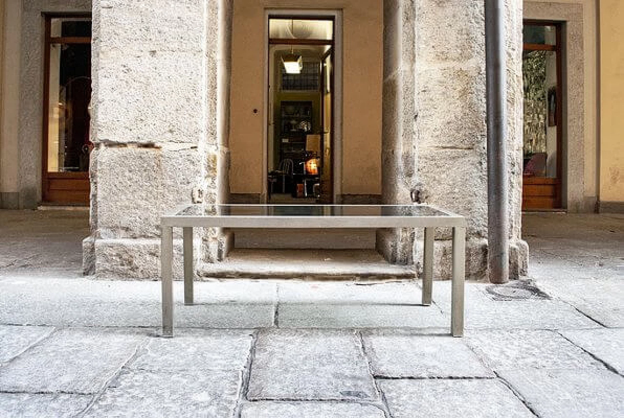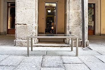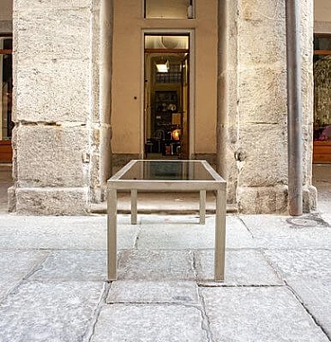 Tavolino da caffè quadrato in vetro e metallo nichelato, anni '70