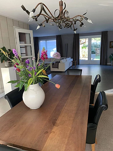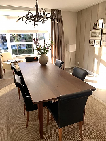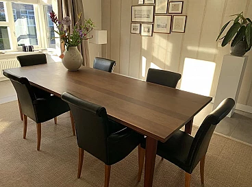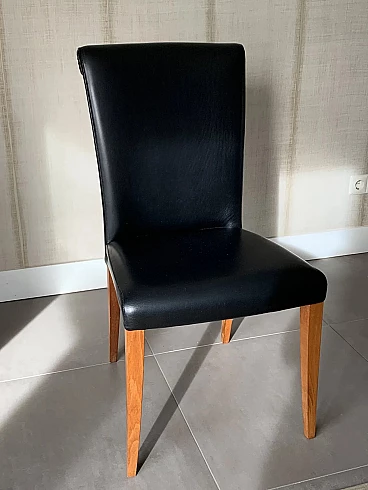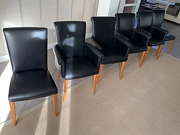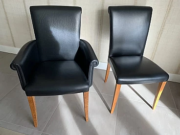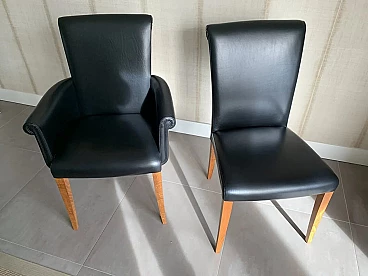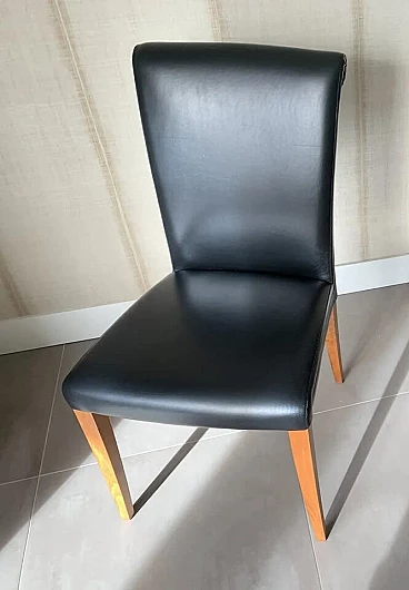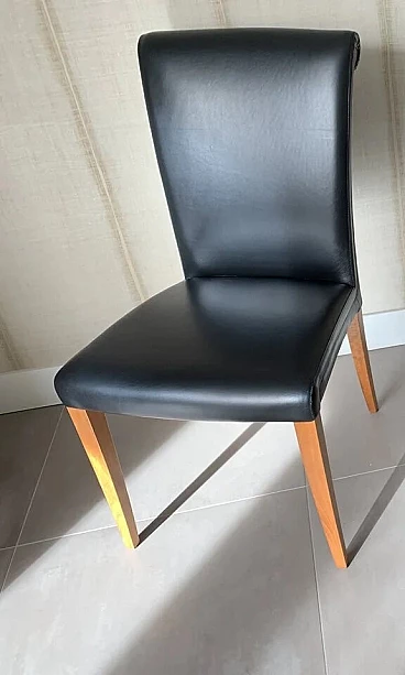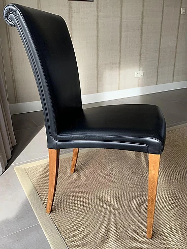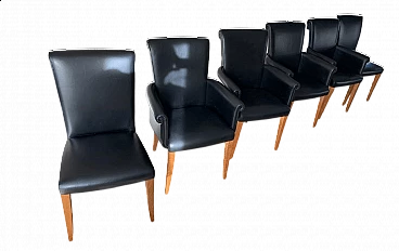 Set di sei sedie Vittoria di Poltrona Frau. Modello senza tempo, in condizioni molto buone con minimi segni di utilizzo. Raffinate sedute per sala da pranzo. La pelle è morbida e in buonissime condizioni, nessun danno. La seduta e lo schienale sono anch'essi in buonissime condizioni. La struttura è in legno massello di faggio, stagionato. Rivestimento esterno in morbida pelle Frau® color nero. La seduta leggermente concava e lo schienale intero sagomato sono imbottiti in poliuretano espanso. Il molleggio della seduta è ottenuto con cinghie elastiche. Vittoria si caratterizza per il suo raffinato schienale, stile '900, che termina con una voluta aperta appena accennata e per il tradizionale rilievo di bordura a filetto.