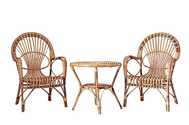 Salottino da esterno degli anni 60. Struttura completamente in rattan ed in condizioni eccellenti. Solo piccolissimi segni del tempo