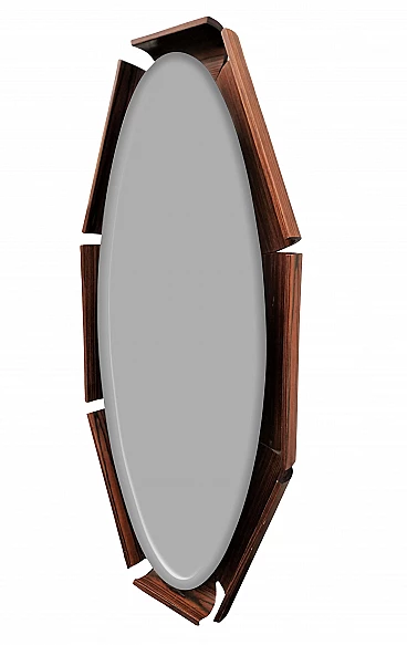 Specchiera ovale retroilluminata su struttura in legno curvato, design attribuibile a I.S.A. Bergamo. Epoca, anni '60/'70. Condizioni ottime, luce funzionante.