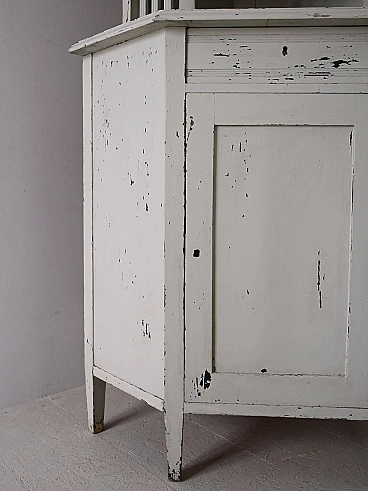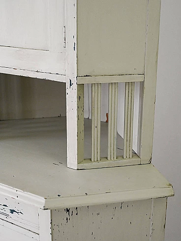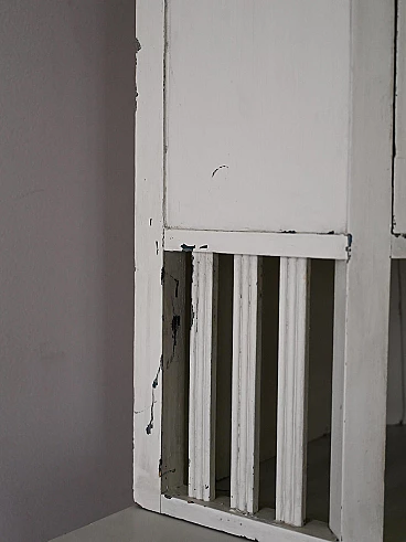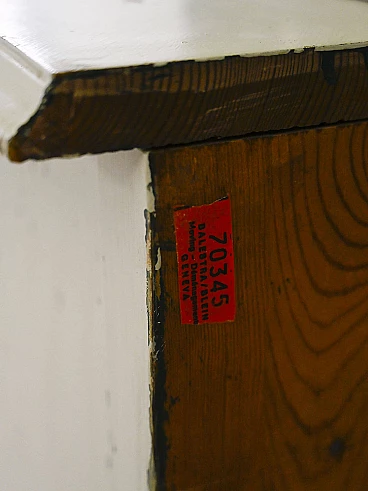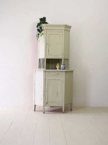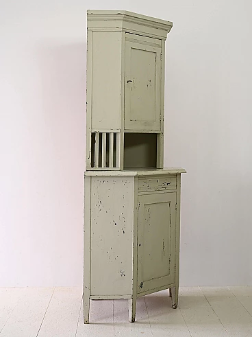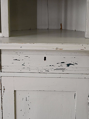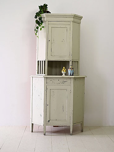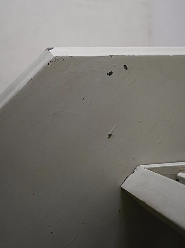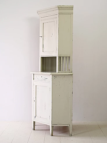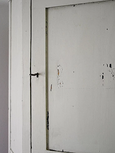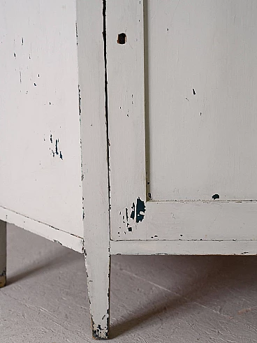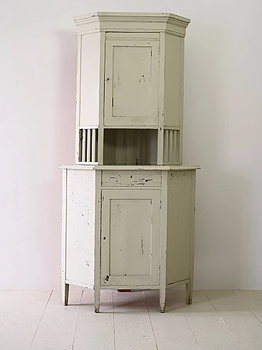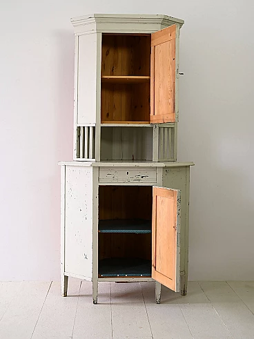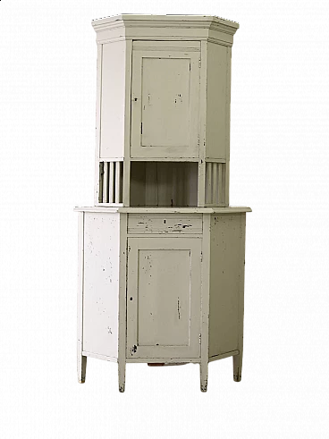 Angoliera scandinava in legno dipinto di bianco, anni '30-'40. La sua struttura è composta da un'anta a battente superiore e inferiore, entrambe dotate di serratura. Al centro, un piano d'appoggio aggiunge versatilità al mobile, offrendo spazio per esporre oggetti decorativi. Il mobile è completato da un cassetto con serratura. Le gambe sottili, caratteristiche dello stile nordico, slanciano la struttura conferendole un aspetto leggero. Buone condizioni. È stato effettuato un restauro conservativo con prodotti di origine naturale. Potrebbe presentare dei segni del tempo. Per piacere prestare attenzione alle fotografie.