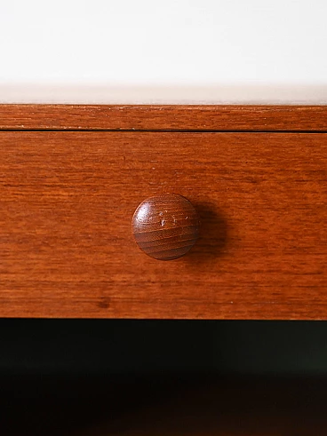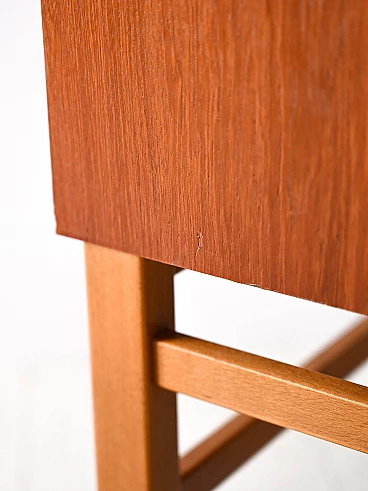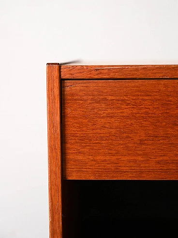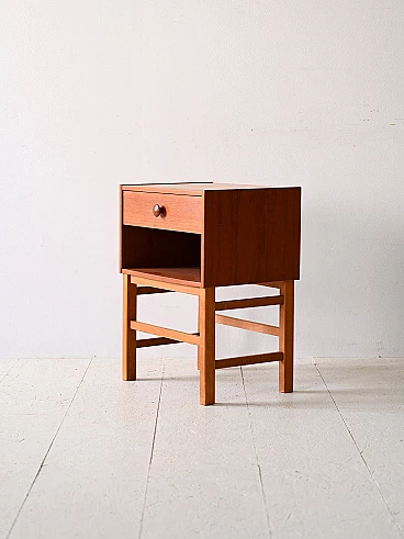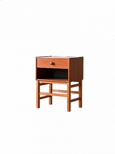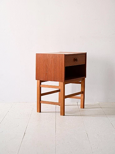 Comodino svedese anni ‘60 con cassetto. Questo comodino compatto non solo si distingue per la sua forma minimale, ma offre anche una massima funzionalità con il suo ampio ripiano. Il cassetto, realizzato in teak, aggiunge un tocco di calore e carattere al design dell’oggetto.