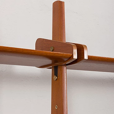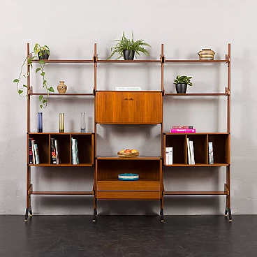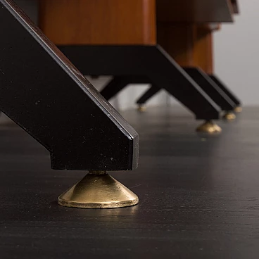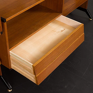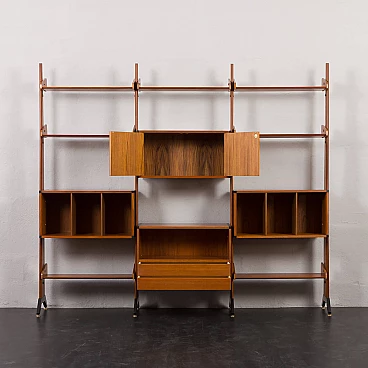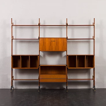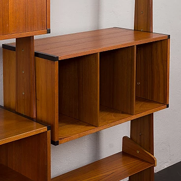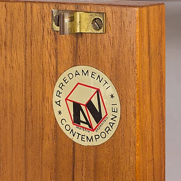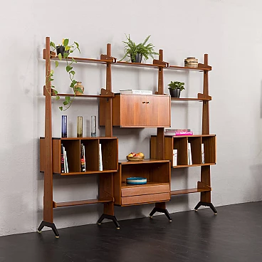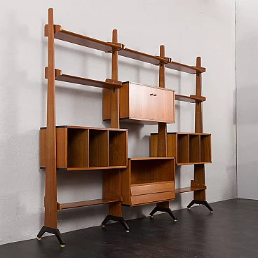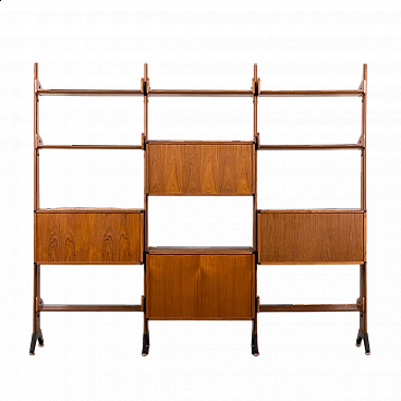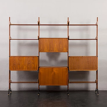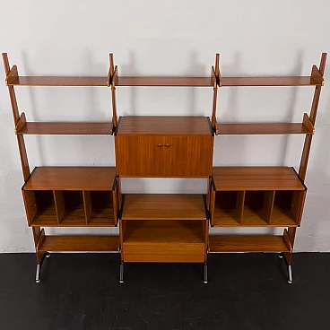 Questa versatile parete attrezzata modulare degli anni '50 o '60 è stata prodotta da AV Arredamenti Contemporanei su disegno di Vittorio Dassi. Vi permetterà di organizzare il vostro spazio in modo pratico ed elegante. Il pensile è dotato di quattro spaziosi armadietti. Due con scomparti funzionali perfetti per conservare i dischi in vinile, uno con una profonda nicchia aperta e due cassetti, e un mobile ad ante con maniglie in legno ben scolpite. Sette ripiani permettono di esporre fiori, libri o decorazioni. La struttura è realizzata in legno massiccio e impiallacciatura di teak con gambe in metallo verniciato nero e piedini regolabili in ottone, per garantire la stabilità su pavimenti irregolari. I bordi in metallo nero di tutti i moduli sono un elemento di design. Questo pensile autoportante è bifacciale. Anche il retro è impiallacciato in teak, il che lo rende un perfetto divisorio per ambienti. I ripiani e gli armadietti sono mobili e possono essere posizionati più in basso, più in alto o scambiati.