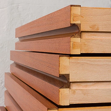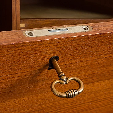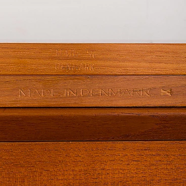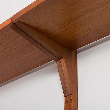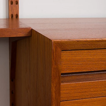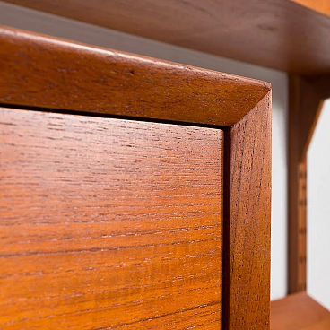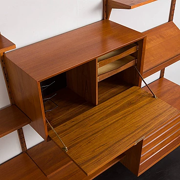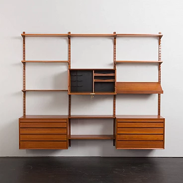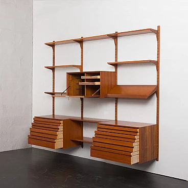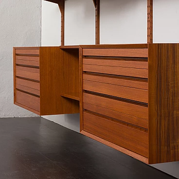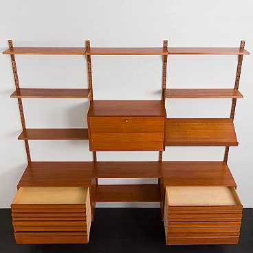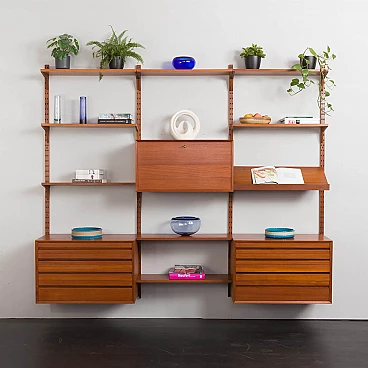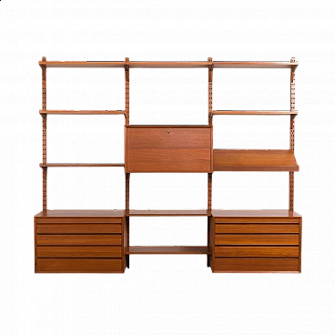 Parete attrezzata a 3 vani in teak, estremamente elegante e funzionale, progettata da Poul Cadovius per Royal Systems (poi ribattezzata Cado), la sua azienda di arredamento. Questo universo di scaffali modulari ha avuto un profondo effetto sul design di metà secolo negli anni '50 e '60. Due spaziosi comò con maniglie ben integrate offrono un ampio spazio di archiviazione, mentre otto ripiani aiutano a esporre libri e decorazioni. Un mobile è disponibile nella versione con frontale a ribalta, con portabicchieri all'interno e due piccoli cassetti a incastro per gli accessori. È perfetto per essere utilizzato come mobile bar. Un ulteriore ripiano espositivo è ideale per esporre foto e immagini. Il set è caratterizzato da una brillante falegnameria e mette in mostra le ricche venature del legno di teak. I mobili sono squisitamente incorniciati dal profilo del bordo leggermente inclinato. Cadovius considerava il sistema Cado uno dei suoi progetti più esclusivi e di successo. Il sistema è molto facile da montare a parete: ogni componente è montato su fori per tasselli senza alcuna sospensione visibile. Il sistema è interamente modulare e consente di disporre armadi e scaffali a piacere.
