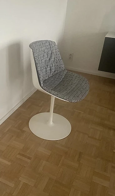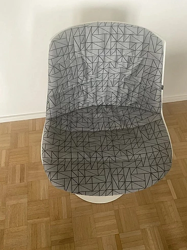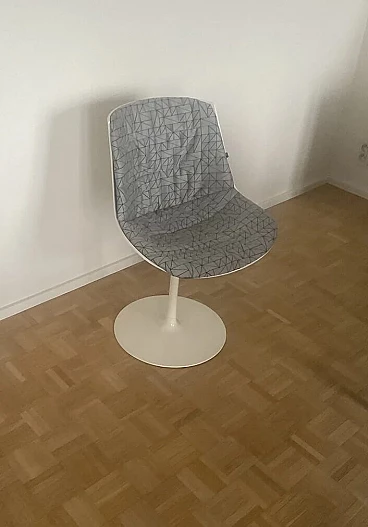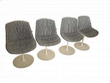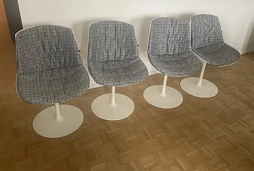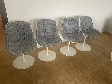 Set di quattro sedie Flow di Jean Marie Massaud per MDF Italia (progettate nel 2009). In ottime condizioni con minimi segni di utilizzo. Scocca a guscio continuo in policarbonato con stampaggio a iniezione, pigmentata in massa, di colore bianco e finitura esterna lucida. Base con stelo verticale realizzato in alluminio verniciato bianco lucido, cod. X060. Guscio girevole a 360°. Supporto totale morbido, tramite imbottitura con controscocca termoformata completa di materassino di poliuretano e ovatta di poliestere trapuntati, rivestimento in tessuto grigio con disegno TRIANGLE categoria F. Altezza della seduta: 44 cm.