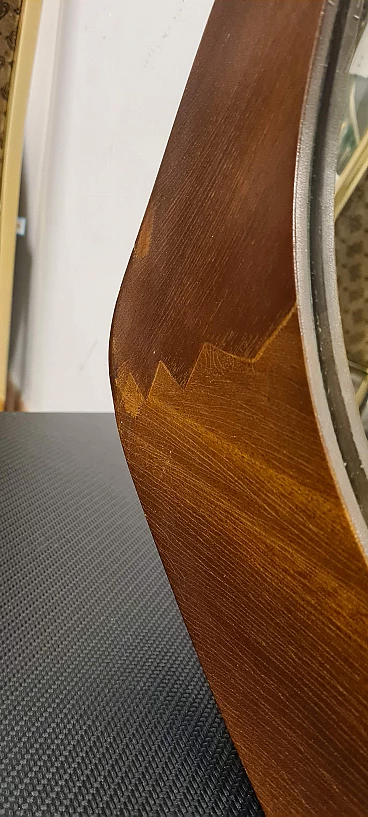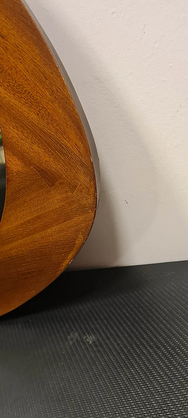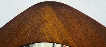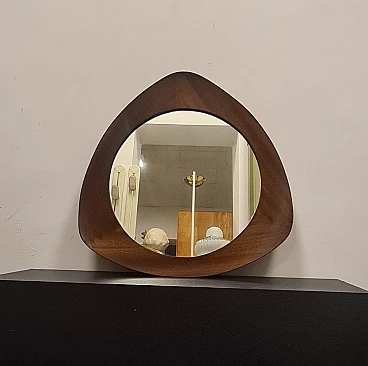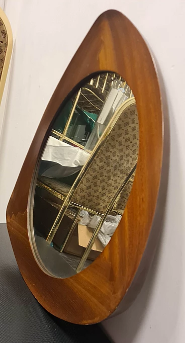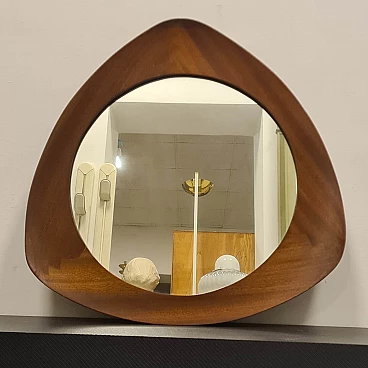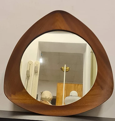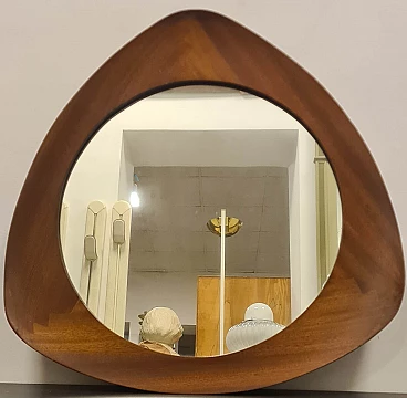 Specchio modello Oscar disegnato da Campo & Graffi. Raffinato specchio dalla forma triangolare curvata prodotto da Home Torino nel 1958 su disegno Di Franco Campo e Carlo Graffi. Rarissimo in quanto la collaborazione tra i due designer e la produzione di mobili dura solo 8 anni. Realizzato in legno di teak e cristallo argentato. Sul retro è presente l'etichetta della manifattura ed è stato pubblicato sul n° 346 di Domus. Lo specchio da parete si trova in ottime condizioni conservative, non ha difetti strutturali ma presenta lievi segni del tempo visibili da foto. Franco Campo e Carlo Graffi si conoscono da studenti universitari presso il politecnico di Torino dove studiano ingegneria e architettura con Carlo Mollino con cui collaborano dopo la laurea. Nel 1956 fondano Home a Torino atelier di mobili innovativi, nel 1964 la fabbrica viene distrutta da un incendio che divide anche le loro strade.