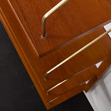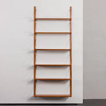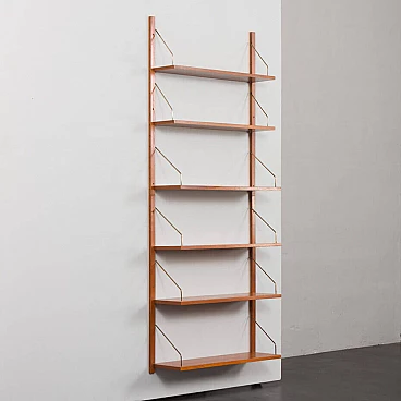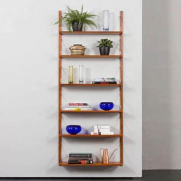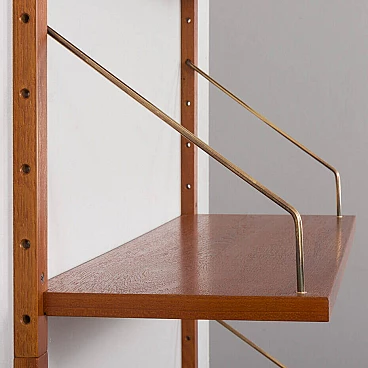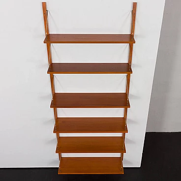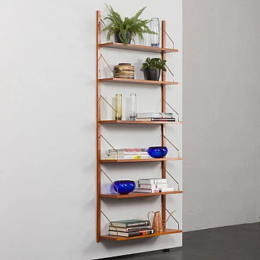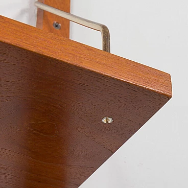 Sistema di scaffalatura modulare di metà secolo, semplice ed elegante, completamente rinnovato, nello stile di Poul Cadovius e Preben Sorensen (sistema di montaggio e falegnameria simili). Questo pensile vintage in impiallacciatura di teak presenta sei scaffali sostenuti da appendini in ottone e montati su binari in legno massiccio. Questo pensile vintage è adatto sia all'ufficio che al soggiorno o alla camera da letto. Poiché tutti i ripiani sono larghi 80 cm, possono essere spostati in basso, in alto e scambiati. I binari sono divisi in quattro parti che consentono diverse impostazioni, tra cui configurazioni parallele e semi-parallele. La configurazione dipende dalle vostre preferenze ed esigenze. L'unità è composta da: 4 ripiani: L: 80 / P: 25 cm; 2 ripiani: L: 80 / P: 20 cm; 4 binari in legno massiccio (100 cm ciascuno); ferramenta in ottone. Gli scaffali provengono da epoche diverse e sono stati uniformati dal nostro team per ottenere un aspetto coerente. Ci concentriamo sul bellissimo motivo delle venature del legno e sul rinnovamento del legno. Utilizziamo varie tecniche, come la levigatura, la mordenzatura e la finitura con olio danese e lacca, per dare agli scaffali il miglior aspetto possibile. A volte è necessario cambiare l'impiallacciatura di quelli più danneggiati. Di solito abbiamo un paio di set come questo. Possiamo preparare un set più grande o personalizzato per voi, se ne avete bisogno. I ripiani possono essere collegati in unità più grandi, composte da 12, 18 e persino 24 pezzi. Gli spazi tra di essi possono essere più piccoli o più grandi, lo decidete voi.