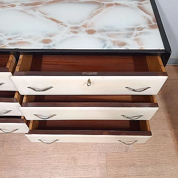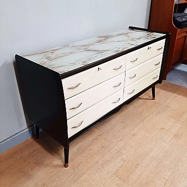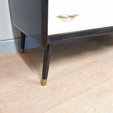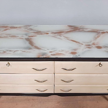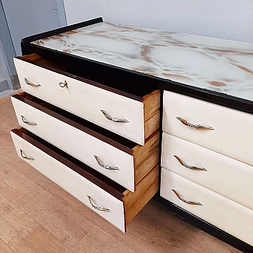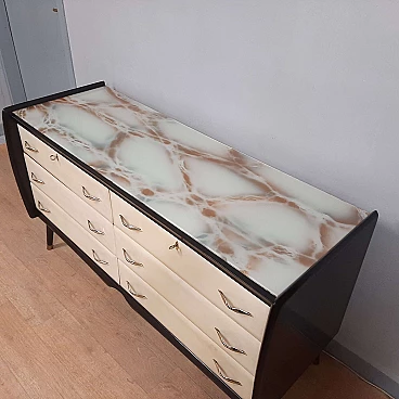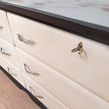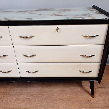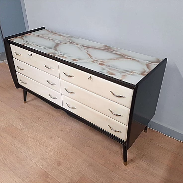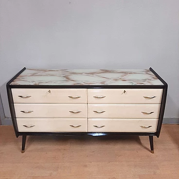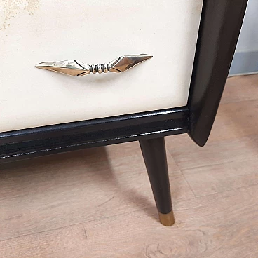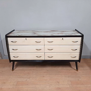 Comò in legno laccato nero, pergamena e vetro marmorizzato, anni '50