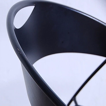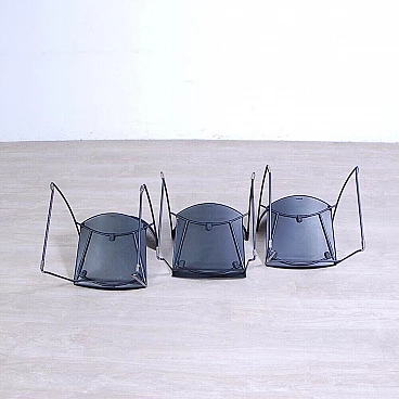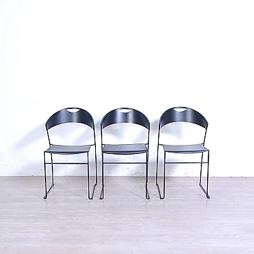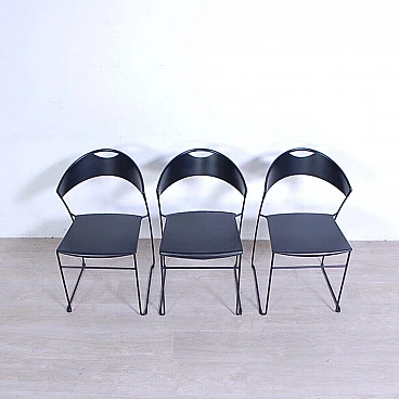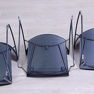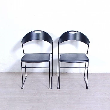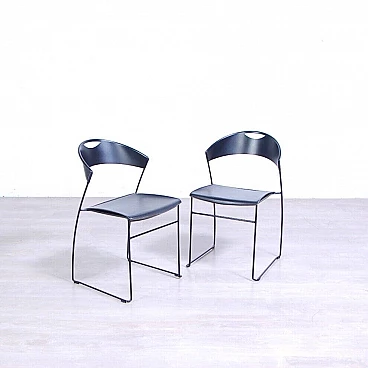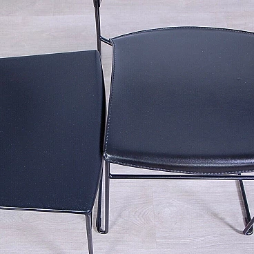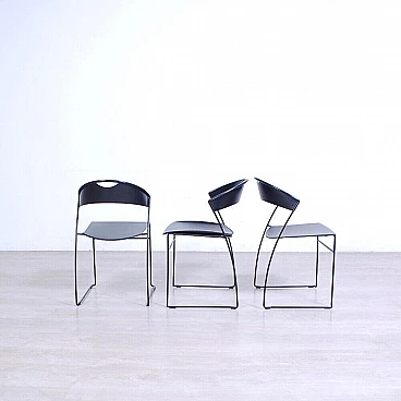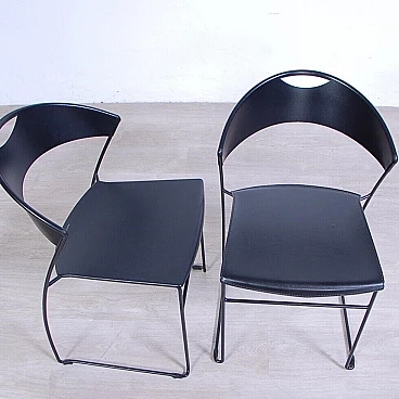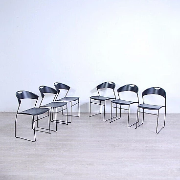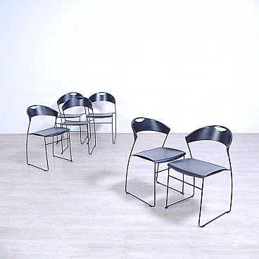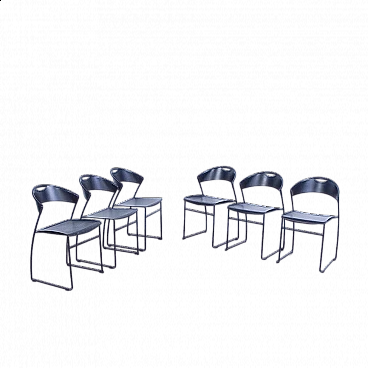 Sei sedie modello 601, design Juliette Hannes Wettstein e produzione Baleri anni '80. Marchio impresso sulla seduta. Le sedie sono caratterizzate da forme curve, realizzate in metallo smaltato nero con struttura leggera alla vista ma ben solida all'uso. Quattro delle sedie sono dotate di copertura della seduta in similpelle originali Baleri. Larghezza 47 cm, profondità 52 cm, altezza della seduta 48 cm, altezza totale 76 cm. Strutturalmente in buone condizioni, sono presenti consueti segni d'usura e del tempo. La struttura metallica presenta alcuni piccoli punti dove si è un po' rovinata la verniciatura nera (vedi foto).