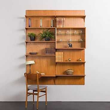 Raro e funzionale pensile in rovere, con pannelli posteriori, disegnato da Poul Cadovius per Cado, la sua azienda di mobili. È uno dei designer i cui sistemi di scaffalature modulari hanno avuto un profondo effetto sul design della metà del secolo negli anni '50, '60 e '70. Sette ripiani e una vetrina in vetro offrono spazio sufficiente per esporre le decorazioni. La vetrina può essere utilizzata anche come libreria, proteggendo i libri dalla polvere. Una scrivania compatta crea uno spazio di lavoro piacevole e discreto. I pannelli posteriori in rovere color miele aggiungono un aspetto di metà secolo e introducono un legno caldo agli interni. Oltre ai vantaggi funzionali, l'unità diventa una grande decorazione sulla parete.