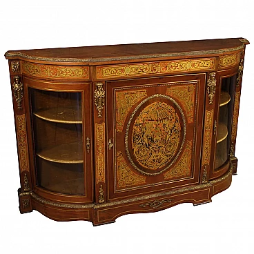 Credenza servante francese del XX secolo. Mobile in stile Boulle in legni di mogano, noce e finta tartaruga riccamente decorato con bronzo e ottone dorato e cesellato. Credenza a tre ante e piano ligneo superiore in carattere, completa di una chiave funzionante. Interno rivestito in velluto tinta senape con qualche piccolo segno di usura. Ante laterali con vetro curvo incassato che permettono la visione degli oggetti all'interno (vedi foto). Anta centrale intarsiata di grande qualità e impatto. Mobile di favoloso arredamento, per antiquari e arredatori, ideale per una sala o salone. Presenta qualche piccolo segno del tempo, nel complesso in buono stato conservativo.