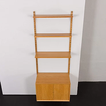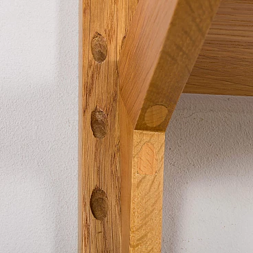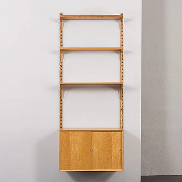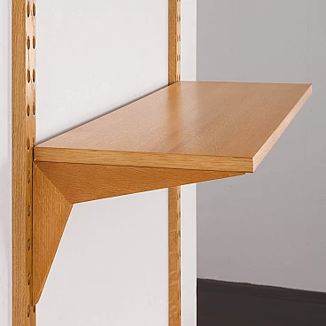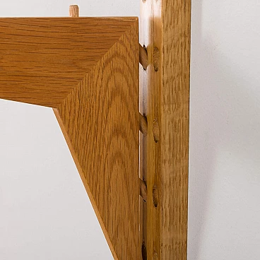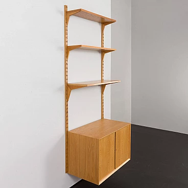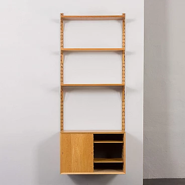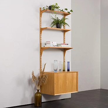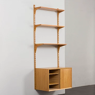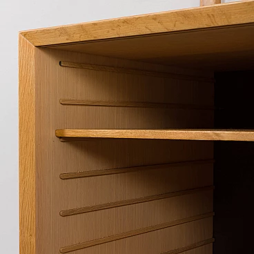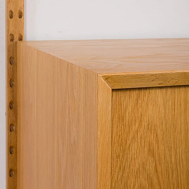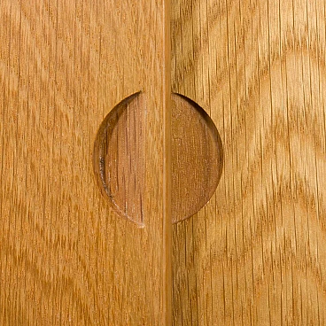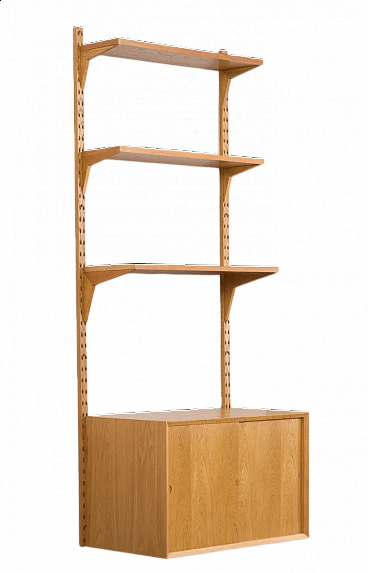 Libreria minimalista a una campata in rovere con ante scorrevoli, progettato da Poul Cadovius. Si tratta di uno dei designer i cui sistemi di scaffalature modulari hanno avuto un profondo effetto sul design della metà del secolo scorso negli anni '50, '60 e '70. Questo sistema di scaffalatura completamente modulare combina un design minimalista e offre spazio di archiviazione in un mobile spazioso e tre ripiani per libri e piccoli oggetti. Il mobile è dotato di quattro ripiani interni che possono essere regolati a qualsiasi altezza. La struttura in legno di rovere chiaro aggiunge calore a qualsiasi ingresso, soggiorno o camera da letto. I sistemi in rovere sono tra i più rari della produzione Cado. I componenti della parete attrezzata possono essere disposti a piacere. Ogni parte può essere spostata ogni 4,5 cm in alto o in basso. La configurazione mostrata è solo un esempio. Si tratta di un meraviglioso esempio della massima qualità del design danese di metà secolo, che combina eleganza, minimalismo e funzionalità, con una maestria artigianale. Il pensile è composto da: un mobile: con ante scorrevoli H: 51,5 / L: 80 / P: 46 cm; 2 ripiani: L: 80 / P: 22 cm; un ripiano: L: 80 / P: 30 cm; 2 binari in legno.