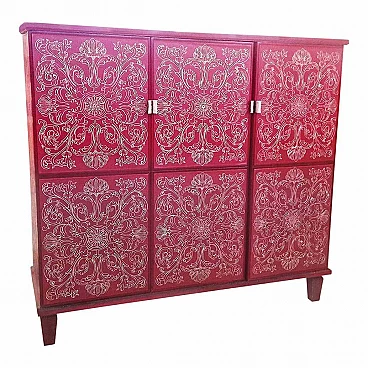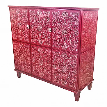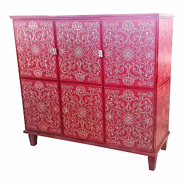 Mobile bar in legno laccato rosso intarsiato, anni '80