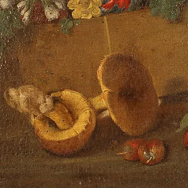 Natura morta con funghi e fiori, dipinto a olio su tela, '700