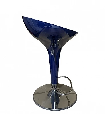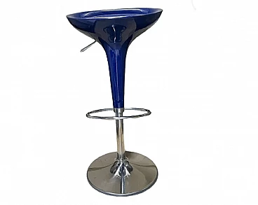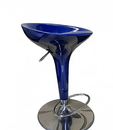 Sgabello Bombo blu di Stefano Giovannoni per Magis. Struttura in acciaio cromato e seduta in ABS blu. Alla fine degli anni '90, Giovannoni e Magis lanciano la serie Bombo: sedie, sgabelli e tavoli stampati in ABS dalle forme sinuose che si innalzano su una base in acciaio. Lo sgabello Bombo, proposto in vari colori e regolabile mediante pistone a gas, affascina con la sua linea levigata e suadente, ulteriormente esaltata dal delizioso poggiapiedi circolare. Una perfetta sintesi di versatilità e carattere che è diventata un punto di riferimento mondiale del made in Italy. Due sgabelli disponibili (prezzo per pezzo).