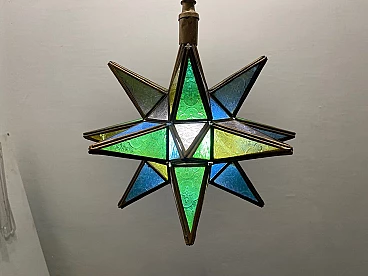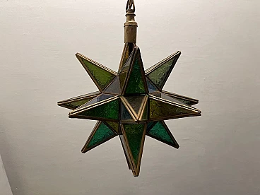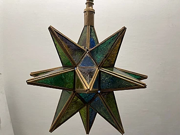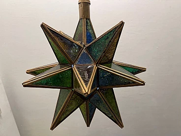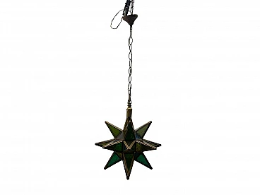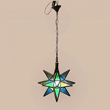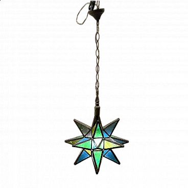 Lampada a sospensione a forma di stella in vetro vintage, anni '70. Prezzo € 350,00 per articolo. Paese di produzione Italia. Struttura in metallo. Altezza compresa la catena e il baldacchino a soffitto 76 cm, altezza senza catena 36 cm, larghezza 30 cm. Caratteristica una luce, richiede lampadina E27. C'è un'apertura per poter cambiare la lampadina. Nuovo cablaggio installato compatibile con Europa, Regno Unito e Stati Unito. Peso sotto i 40 kg. Buone condizioni. Questo articolo vintage/antico può presentare alcuni segni di usura come graffi e altri segni del tempo. Questo pezzo è funzionante? Sì, ho fatto ricablare il pezzo da un elettricista professionista.