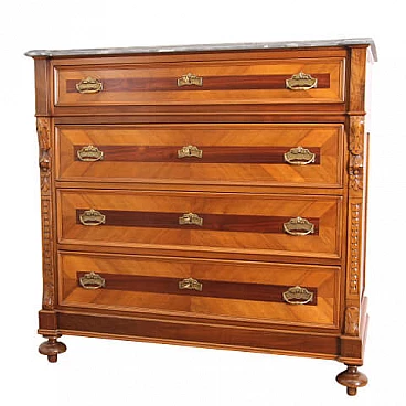 Antico cassettone in noce toscano epoca fine 800 , restaurato , presenta cassetti lastronati in essenza noce chiaro e scuro e montanti intagliato finemente floreale e frutta sul massello. Cerniere e ferramenta coeva ! Piano in marmo bardiglio, piedi a cipolla . Pronto da inserire in ambiente.