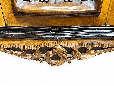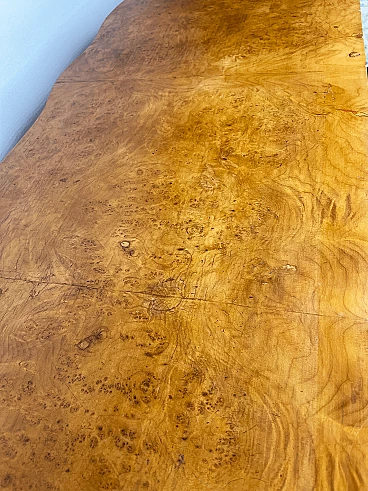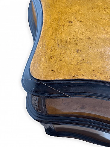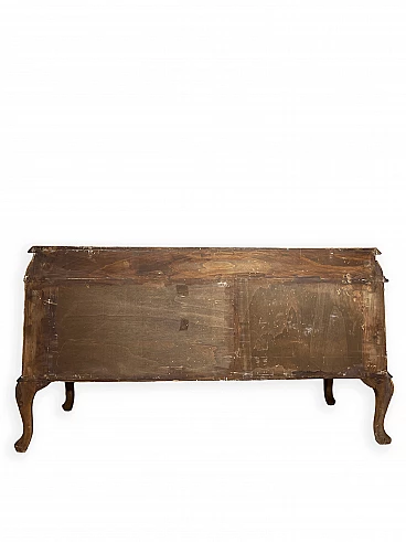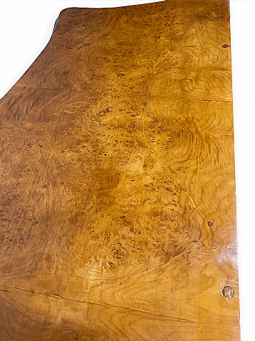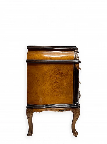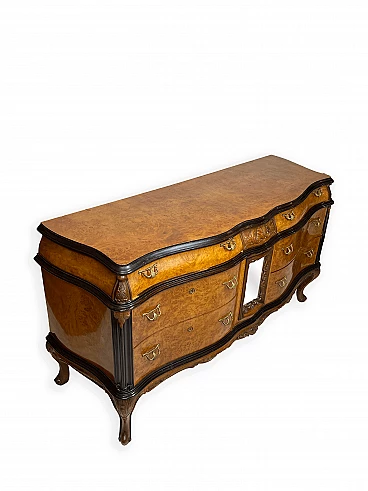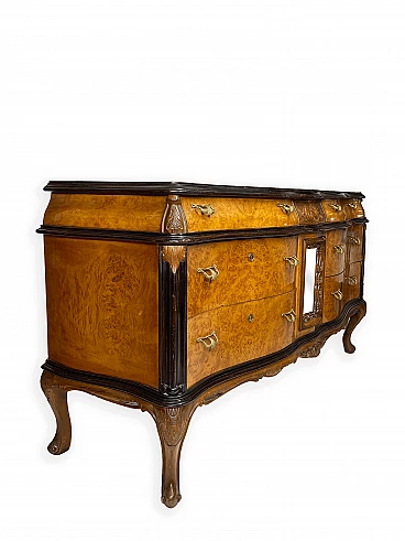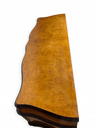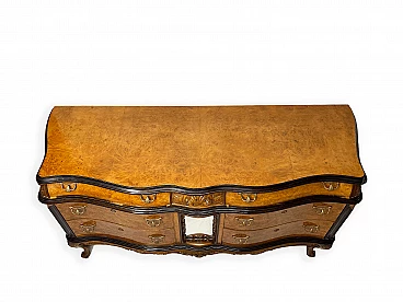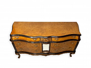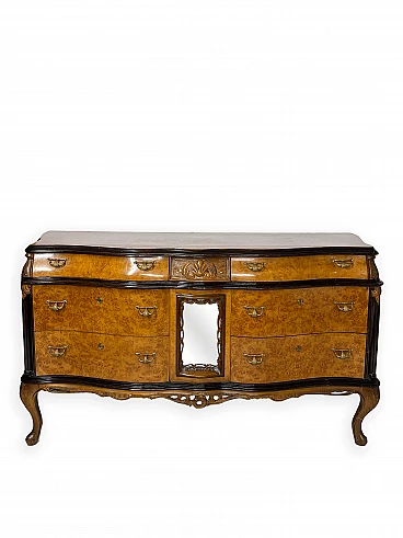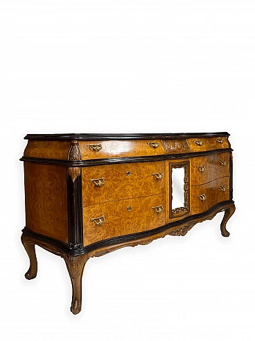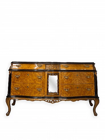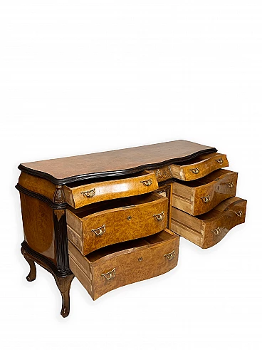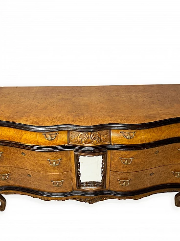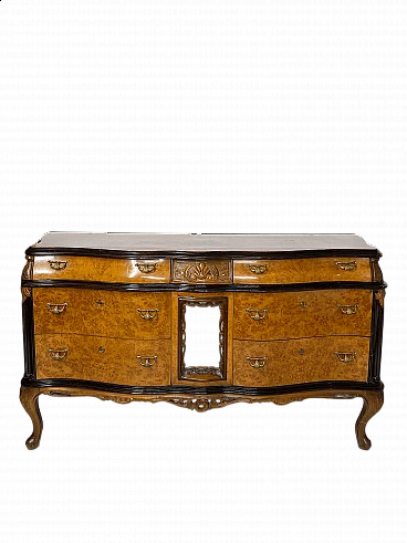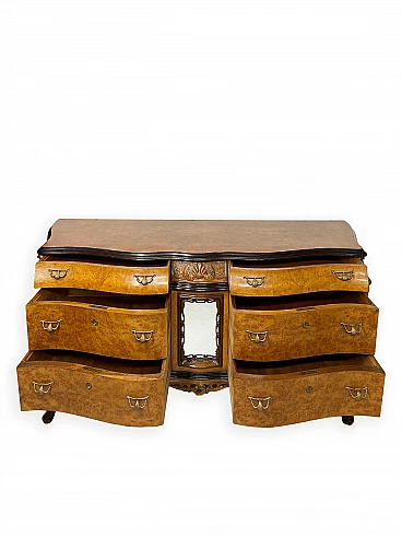 Cassettiera genovese in radica di noce, anni '40 circa. Molto bella, ben fatta e decorativa. La patina è molto lucida e splendida. Di squisita fattura artigianale, è realizzata in radica di noce riccamente venata di colore chiaro e caldo. Piano in radica di noce di grande impatto visivo con bordo sagomato a gradini. Corpo con frontale a serpentina dotato di sei ampi cassetti; c'è anche una lastra a specchio incorniciata al centro, sopra il grembiule traforato smerlato. Il mobile poggia su gambe cabriole in noce massello intagliato terminanti con piedini a spirale. Sono presenti delle crepe in un punto, sotto la lastra dello specchio (vedi foto). In condizioni originali molto buone, coerenti con l'età e l'utilizzo.