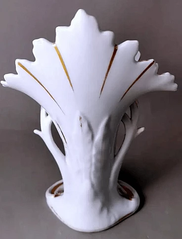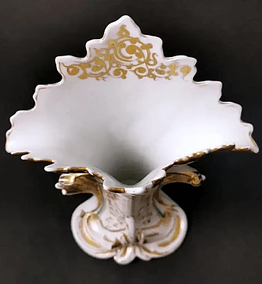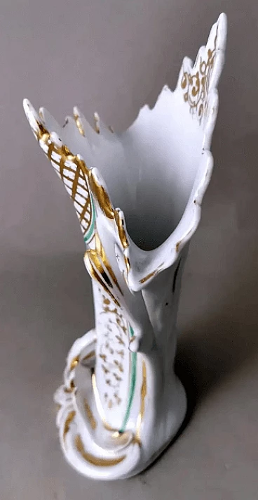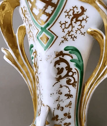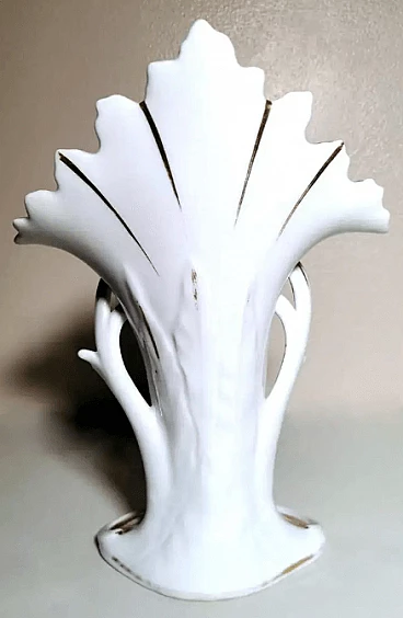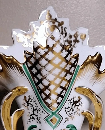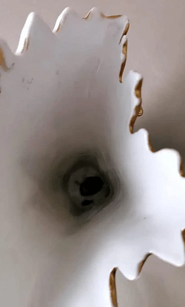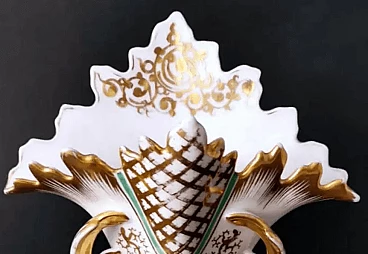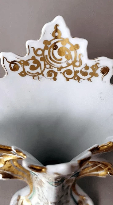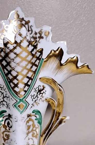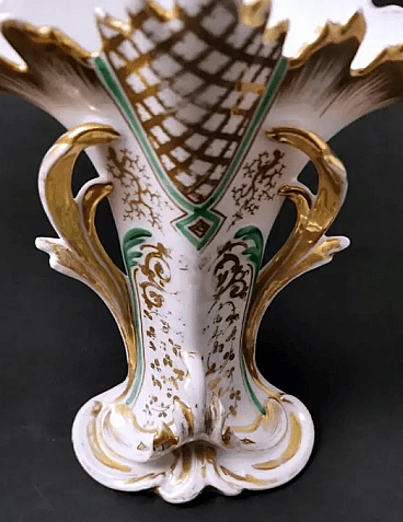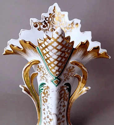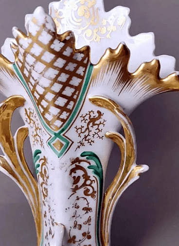 vaso da matrimonio francese è realizzato in porcellana bianca; tutta la superficie è stata accuratamente dipinta a mano con raffinati decori in oro zecchino; la forma elegante e vibrante del vaso ricorda il fiore smerlato dell'Angiosperma. Questo tipo di vaso in Francia veniva chiamato “vaso nuziale” (vase d'Eglise marièe) perché veniva portato dagli sposi nella chiesa dove si svolgevano le nozze per abbellire l'altare durante la cerimonia; poiché il vaso rimaneva poi di proprietà della chiesa, gli sposi per risparmiare sui costi avrebbero incaricato l'artigiano che lo aveva realizzato di decorare solo la parte anteriore, quella rivolta verso i fedeli, lasciando incompleta la parte posteriore, che sarebbe rimasta nascosta agli occhi dei fedeli.