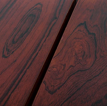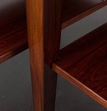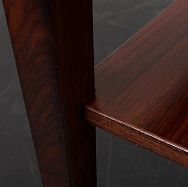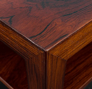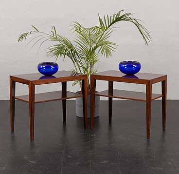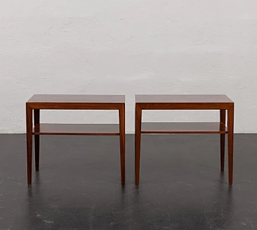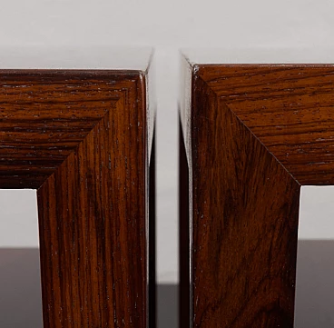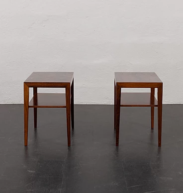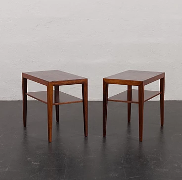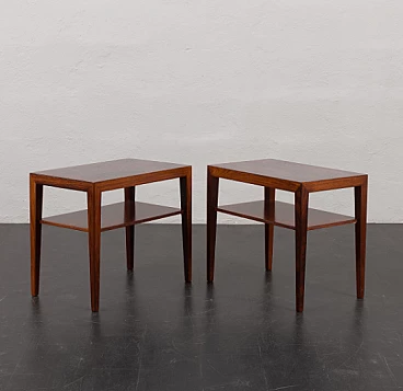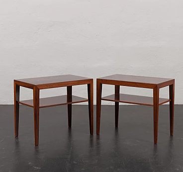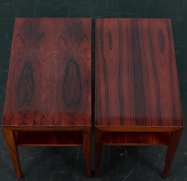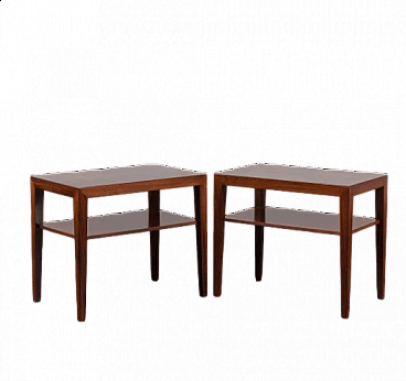 Coppia di comodini/tavolini in palissandro di Severin Hansen per Haslev Møbelfabrik (Danimarca), anni '60. Forma minimalista, grande maestria. Questi comodini/tavolini sono caratterizzati da silhouette angolari, gambe affusolate e ottimi elementi di falegnameria. Un ulteriore ripiano inferiore offre spazio funzionale per libri od oggetti più piccoli ma può anche essere tolto se necessario. Le ricche venature dei piani in palissandro aggiungono eleganza ai pezzi; a nostro avviso, la grana irregolare su entrambi i piani rende la coppia molto più interessante. La qualità superiore e l'autenticità sono confermate dall'adesivo del produttore e dall'etichetta Dutch Control, che costituiscono un elemento distintivo per i migliori produttori di mobili. Altezza ripiano inferiore: 32 cm. Sono in ottime condizioni e i piani sono stati rifiniti con uno spesso strato di nuova lacca per aggiungere sia una protezione in più sia per migliorare l'aspetto del legno.