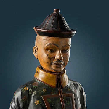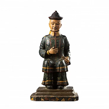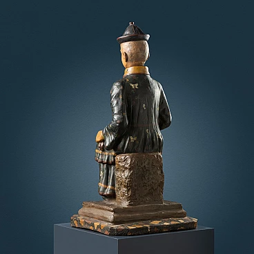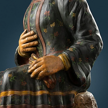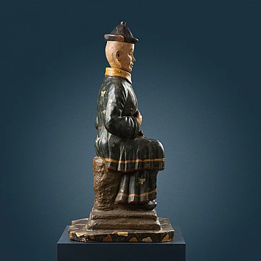 Scultura in terracotta dipinta in policromia con testa basculante, raffigurante figura di dignitario cinese in posizione assisa nell'atto di stringere con la mano sinistra un tessuto, mentre la mano destra è portata al ventre. La scultura poggia su una base marmorizzata. Lievi perdite di colore e restauro sul copricapo. I magot, omini ritraenti originariamente Pu-Tai, il dio cinese della felicità e dell'abbondanza, nascono nella Cina settentrionale e tra Seicento e Settecento giungono in Europa, dove al pari di tante altre cineserie diventano lo status simbol delle case aristocratiche.