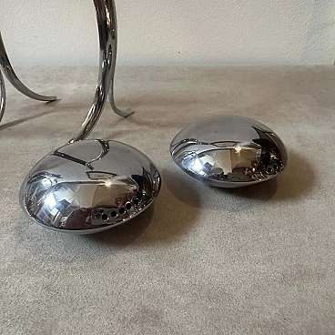 I dispenser per sale e pepe di Mesa incarnano lo spirito eclettico e innovativo del design postmoderno, incorporando materiali di lusso e utilità funzionale. Realizzati in Italia negli anni '90, questi dispenser mostrano l'influenza del post-modernismo con forme audaci, dettagli giocosi e accostamenti inaspettati. La struttura argentata emana eleganza e raffinatezza. Ogni dispenser presenta un design distinto che riflette la propensione dell'epoca alla sperimentazione e all'estro. Oltre al loro fascino estetico, i dispenser sono progettati per un uso pratico, con meccanismi che consentono di dosare facilmente il sale e il pepe. L'aspetto funzionale è perfettamente integrato nel design complessivo, assicurando che siano tanto comodi da usare quanto di grande impatto visivo. Mesa è un'azienda italiana che opera nel settore del design italiano da oltre 40 anni. Fin dalle sue origini, Mesa si è distinta per l'altissima qualità delle sue creazioni artigianali, ideate, progettate e realizzate interamente in Italia, pezzi unici che possono essere creati esclusivamente a mano. Ogni lavorazione è tradizionale e curata con attenzione da artigiani italiani esperti del settore, che danno vita a oggetti unici dalle proprietà tecniche e qualitative ineguagliabili. Dagli inizi a oggi, i laboratori Mesa si sono ampliati mantenendo la filosofia che ha dato vita all'azienda: produrre in Italia in piccole quantità, piegare, saldare, lucidare e argentare esclusivamente a mano. Ogni passaggio artigianale che si nasconde dietro la bellezza degli oggetti Mesa rivela un po' della personalità di chi li ha realizzati.