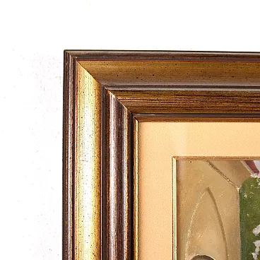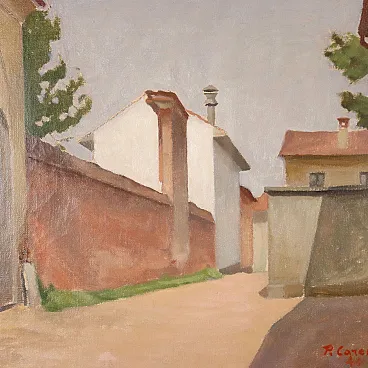 Lo scorcio di paese ben esprime il sommesso intimismo associato al rigoroso realismo che caratterizzano la produzione pittorica del pittore pavese.