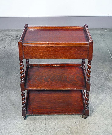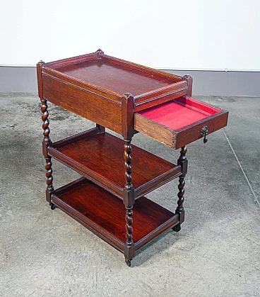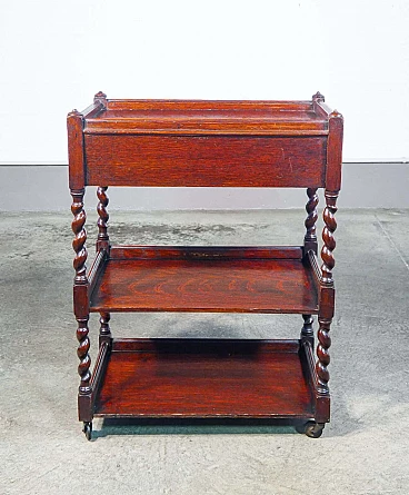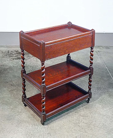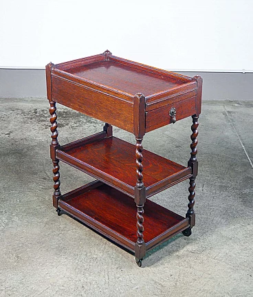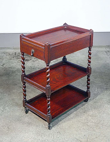 Etagere a tre ripiani in legno di rovere con cassettino e ruote, '800