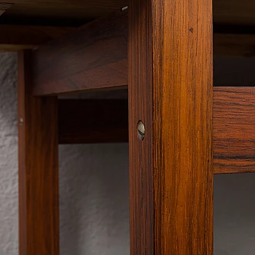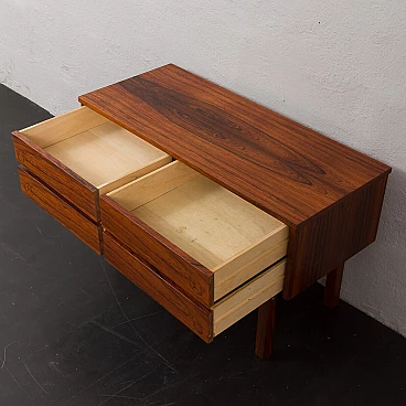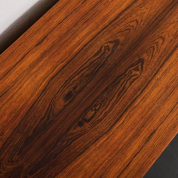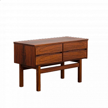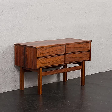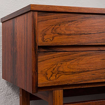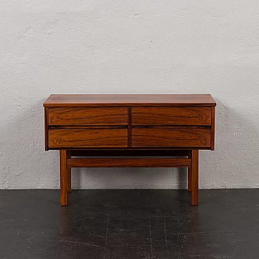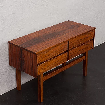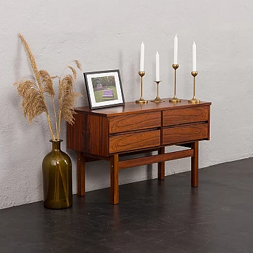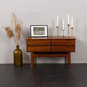 Consolle scandinava realizzata in Danimarca negli anni '60-'70. La sua bella impiallacciatura in palissandro dalle ricche venature e la vibrante tonalità rosso scuro la rendono un vero e proprio richiamo visivo, adatto a qualsiasi interno moderno. La sua forma armoniosa e geometrica rende la consolle un puro simbolo del design minimalista e moderno di metà secolo. Grazie alle sue dimensioni, la consolle può essere inserita anche in interni di piccole dimensioni, aggiungendo un tocco di calore e spazio per riporre gli oggetti più piccoli. Sarà perfetta anche sotto un grande specchio o un quadro. Dimensioni aggiuntive: altezza dei cassetti: 8 cm, altezza dal pavimento: 20 cm.