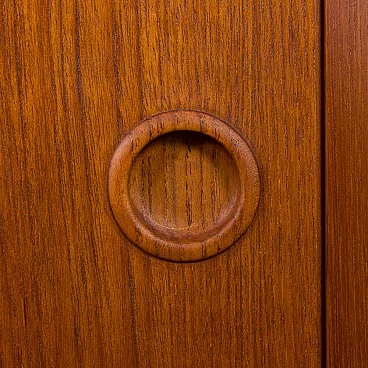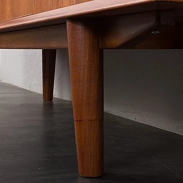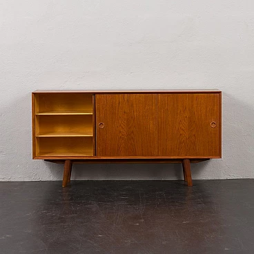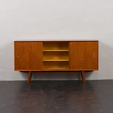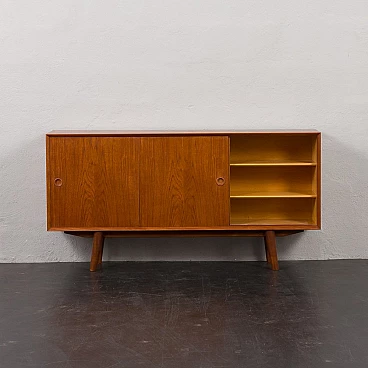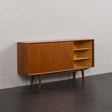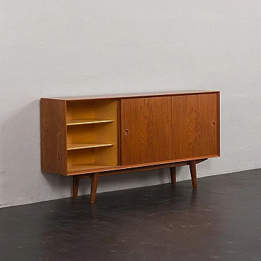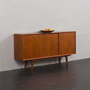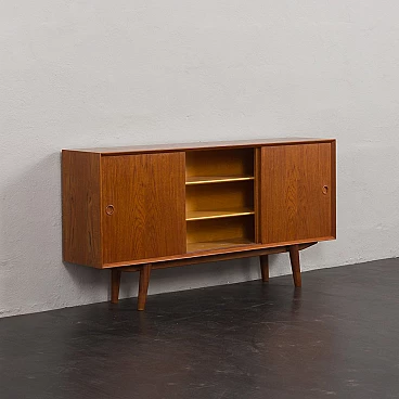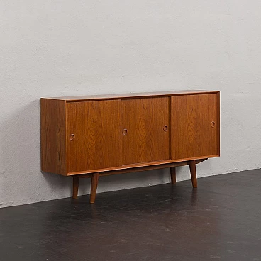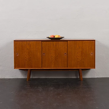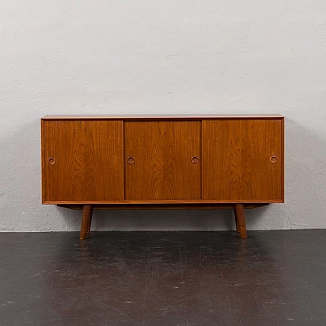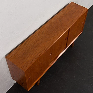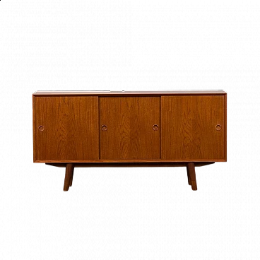 Credenza in teak di metà secolo con ante scorrevoli, progettata e prodotta in Danimarca negli anni '60, fornirà un notevole spazio di archiviazione arricchendo qualsiasi interno con un design moderno scandinavo. La credenza è dotata di una comoda soluzione a tre ante scorrevoli, che riduce lo spazio davanti al mobile quando necessario, senza limitare l'accesso al suo interno. L'interno spazioso presenta due ripiani regolabili sul lato sinistro e due lunghi ripiani regolabili dal centro alla fine. L'eccellente falegnameria combinata con dettagli in teak massiccio come la base trapezoidale e le maniglie sagomate mostrano la maestria del design danese di metà secolo. La credenza è stata controllata dal nostro team. Ci siamo assicurati che l'interno fosse pulito e che le porte funzionassero correttamente. Abbiamo pulito a fondo il legno e lo abbiamo ringiovanito con strati di olio danese. Lasciamo piccoli segni d'uso che non rovinano l'estetica e confermano solo l'originalità. Cerchiamo di riportarlo al suo aspetto migliore, sempre considerando che ha 60 anni. Clienti di tutto il mondo si sono già fidati del nostro lavoro e dei suoi frutti. Se siete alle prime armi con i mobili vintage, potete contattarci per eventuali spiegazioni e primi piani del pezzo. Nel complesso, ottime condizioni vintage con lievi tracce d'uso. Dimensioni aggiuntive: altezza da terra 20 cm.
