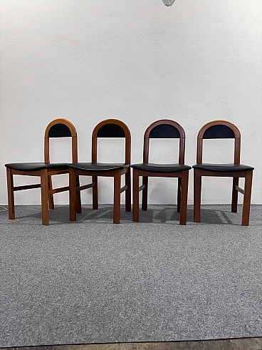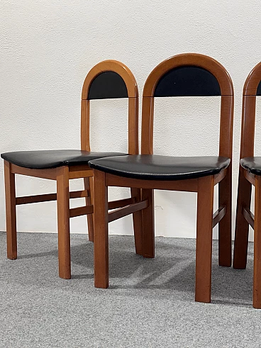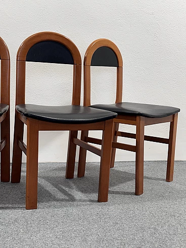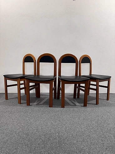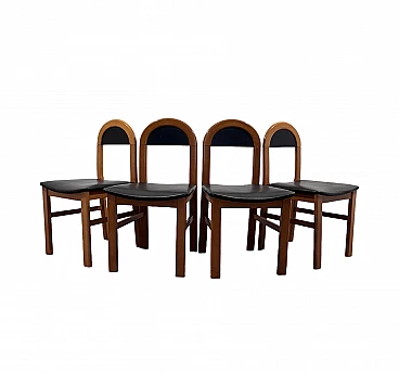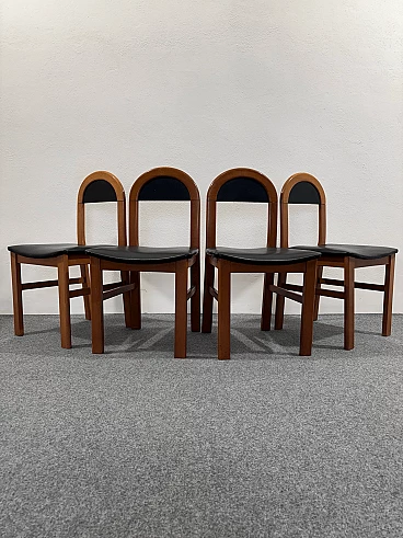 Set di quattro sedie da pranzo, anni '60. Struttura interamente in legno e rivestimento in ecopelle nera. Ottime condizioni conservative, non vi è alcun difetto estetico o strutturale da segnalare, solo lievi e ovvi segni del tempo dovuti all'utilizzo e all'età (vedi foto).