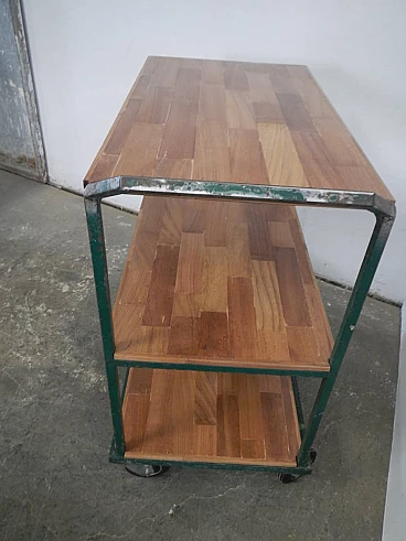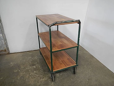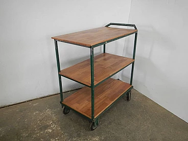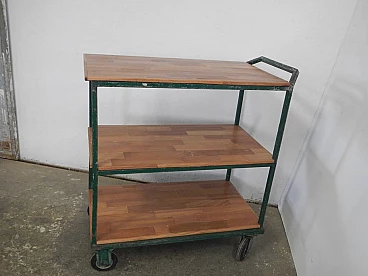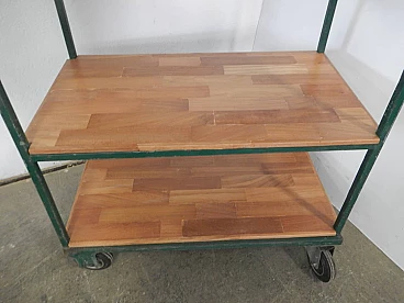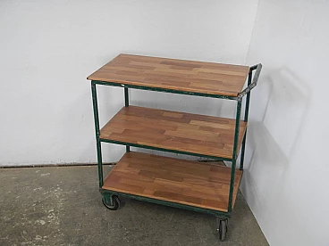 Carrello da officina in ferro verde con mensole in quercia, anni '70