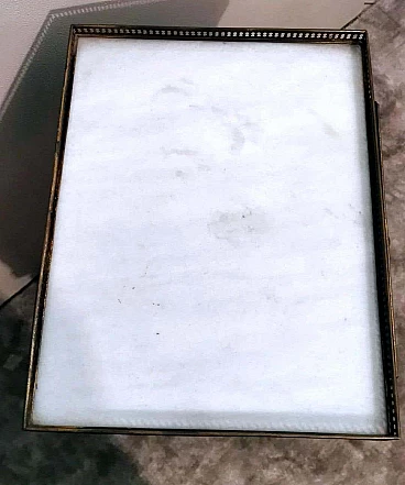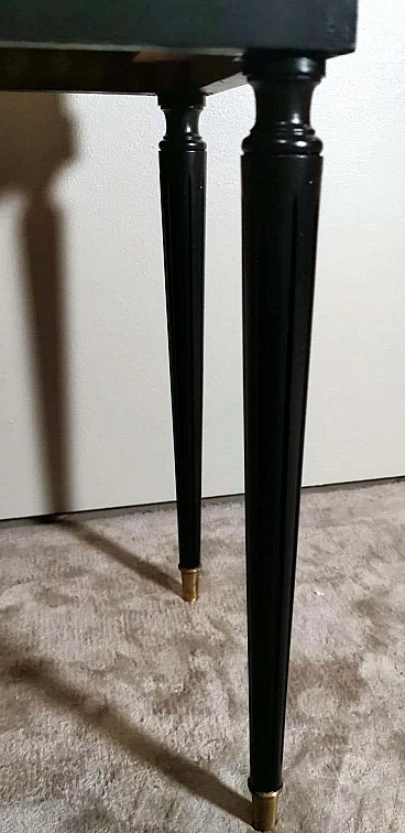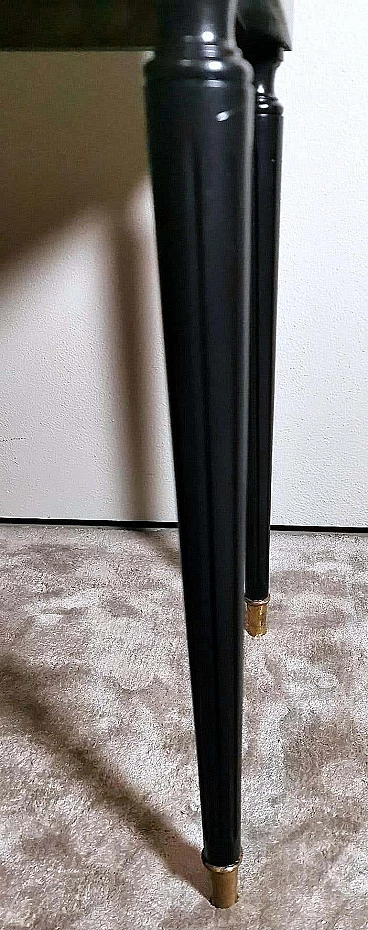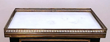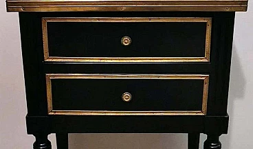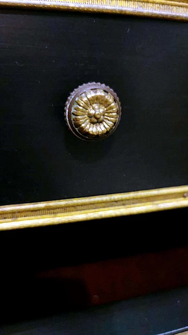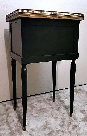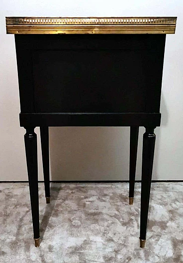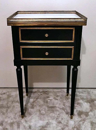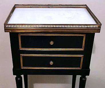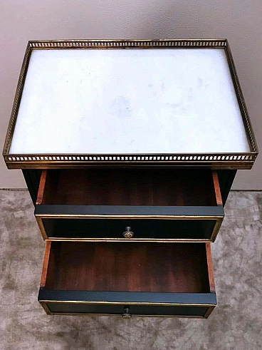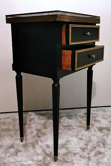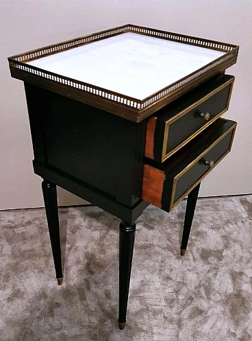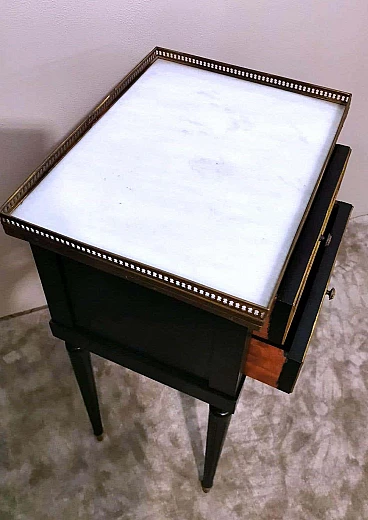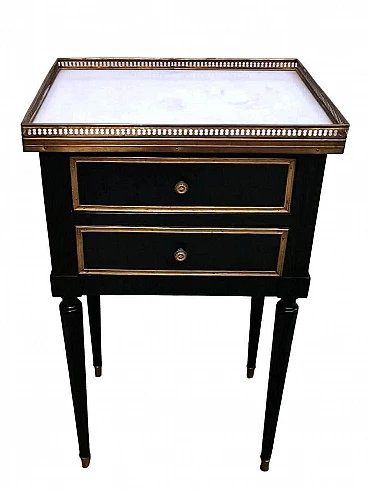 Elegante e raffinato comodino francese in stile Napoleone III; presenta sul fronte due ampi cassetti, il frontale è sagomato ed è circondato da una cornice in filo d'oro; i pomelli sono costituiti da una bella fusione in ottone che rappresenta un fiore con una corona di foglie, sempre in ottone sono le protezioni che si trovano all'estremità delle gambe; sempre in ottone brunito è la raffinata ringhiera che protegge il piano in marmo; le quattro gambe sono affusolate verso il basso e presentano scanalature lungo il corpo; l'intero comodino è realizzato in rovere, un legno che per la sua robustezza e resistenza viene utilizzato per la costruzione di mobili pregiati e durevoli; la verniciatura nera lo rende esclusivo e personale. Il marmo utilizzato per il piano è un "Bianco Statuario di Carrara", estratto dalle cave delle Alpi Apuane nel territorio di Carrara (Toscana-Italia); è uno dei marmi più chiari, con un tasso di impurità molto basso. Ha una formazione antichissima che risale a quasi 200 milioni di anni fa, quando la Toscana settentrionale era completamente ricoperta dal mare sul cui fondo si depositarono sedimenti calcarei che permisero la formazione di questo meraviglioso marmo bianco, caratterizzato da una pasta di fondo omogenea con granuli lucidi. È una delle varietà della famosa pietra viva, e non è un caso che tutti i più grandi scultori e artisti della storia (Michelangelo, Donatello, Bernini. Canova) abbiano realizzato le loro opere più famose proprio con questa eccellente varietà di marmo, dalle tonalità così eleganti da sembrare quasi eterea. Il comodino è stato prodotto in stile Napoleone III tra il 1880 e il 1885 da un laboratorio artigianale della città francese di Liffon-le-Grand, situata nel dipartimento dei Vosgi, nella regione del Grand Est. Lo stile Napoleone III riprende le forme più serie e austere del Primo Impero. Tuttavia, l'Eclettismo, che contraddistinse il periodo, lo rese più aggraziato, raffinato ed elegante, riflettendo e ben rappresentando il periodo socio-culturale ed economico che la Francia stava vivendo all'epoca. L'oggetto è stato trattato a mano con antiche tecniche di restauro dal nostro team di artigiani ed è in ottime condizioni. Misura larghezza 43 cm, profondità 34 cm, altezza 74 cm. Per tutte le nostre spedizioni utilizziamo materiali di imballaggio speciali (casse di legno su misura, polistirolo, ecc.) per la massima protezione e sicurezza degli oggetti.