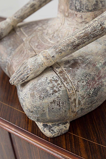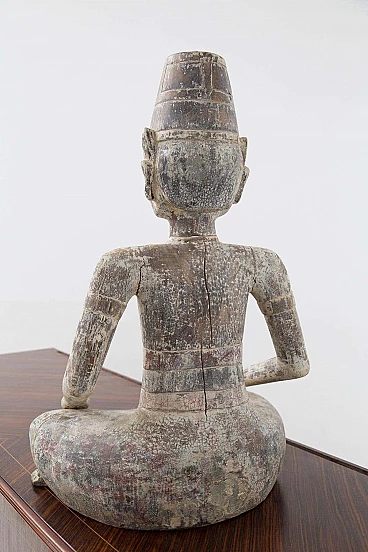 Nel cuore di Bali, tra i lussureggianti paesaggi tropicali e i sussurri di antiche tradizioni, si trova un'affascinante statua di legno che racconta una storia di devozione e serenità. Si ritiene che questo squisito pezzo d'arte, scolpito interamente in legno, abbia origine nell'incantevole isola di Bali, dove l'essenza della spiritualità indù scorre come un fiume sacro. Guarda la statua e sarai trasportato in un regno di tranquillità, dove un sacerdote indù balinese siede in una posizione di profonda meditazione, con le gambe graziosamente incrociate, perso nel ritmo delle sue preghiere. La figura, scolpita con meticolosa maestria, ha un volto di sorprendente bellezza e serenità espressiva. Ogni dettaglio, ogni linea incisa nel legno, è una testimonianza dell'abilità e della riverenza dell'artista che ha dato vita a questo capolavoro. La nobile testa del sacerdote è ornata da una regale corona sacerdotale, simbolo della sua autorità spirituale e del suo legame con il divino. Il suo abbigliamento, una giacca in vita finemente dettagliata e un pareo fluente, scorre con grazia intorno alle sue forme, alludendo ai rituali sacri che deve aver eseguito. Un singolo e delicato braccialetto abbellisce il polso sinistro, un accento sottile che aggiunge fascino alla statua. Lo scopo preciso di questa straordinaria creazione rimane avvolto nel mistero. Mentre molte statue di legno a Bali venivano spesso utilizzate come elementi architettonici, questa si distingue. La sua delicata intricatezza e la sua chiara intenzione di essere un pezzo a sé stante suggeriscono uno scopo completamente diverso. Ci invita a riflettere sul suo significato, invitandoci a svelare i segreti che potrebbe contenere. Quando ci troviamo davanti a questo capolavoro, veniamo trasportati indietro nel tempo, all'inizio e alla metà del XX secolo, un periodo in cui il mondo era in transizione, ma lo spirito di Bali rimaneva saldo nella sua devozione al divino. Questa statua, testimonianza senza tempo di quella fede duratura, continua ad affascinare con la sua grazia e la sua bellezza, invitandoci a connetterci con l'eredità spirituale di Bali e con la serenità di un sacerdote balinese perso nell'eterna danza della preghiera.