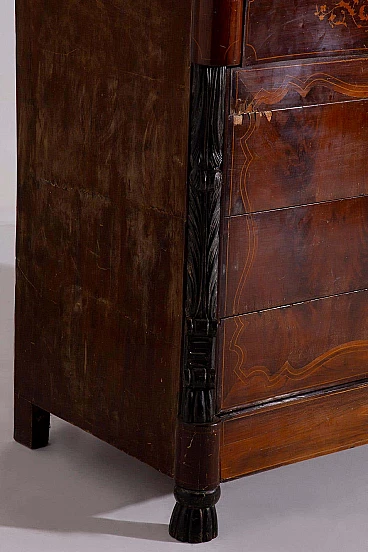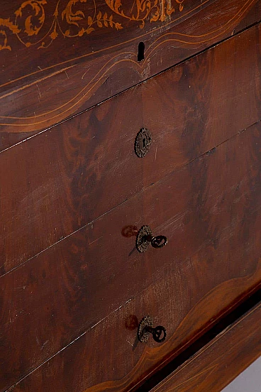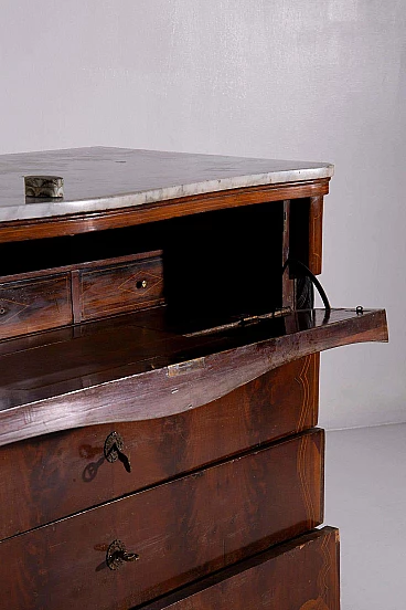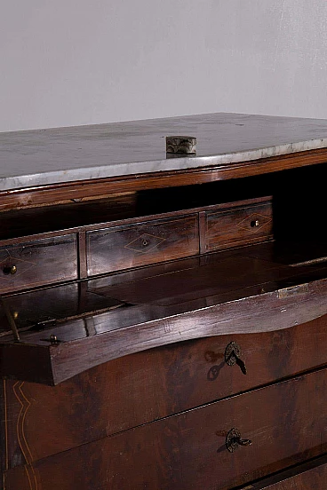 Nel vasto mondo dell'arredamento antico, pochi pezzi hanno la capacità di trasmettere una bellezza intrinseca e una maestria artigianale così profonda come lo squisito cassettone in noce italiano della fine del XVIII e dell'inizio del XIX secolo. Questo straordinario mobile rappresenta una sublime espressione dell'arte e del design italiano dell'epoca, con la sua lavorazione intricata e i caldi riflessi del legno di noce. La caratteristica più distintiva di questa cassettiera è senza dubbio il piano in marmo, un tocco di lusso che conferisce un'aura di nobiltà al pezzo. Il legno di noce accuratamente selezionato, che porta i segni del suo viaggio nel tempo, è un testimone silenzioso della storia di cui è stato testimone e della maestria artigianale che lo ha plasmato. Oltre alla sua pura bellezza, questa cassettiera nasconde intriganti segreti. Esplorando la sua struttura, ci si imbatte in un quarto cassetto che sembra nascondere qualcosa di più. Con una piccola chiave, il cassetto si apre per rivelare uno splendido scrittoio. Sollevando con grazia il frontale a ribalta, si scopre un inserto in tessuto di pelle, pensato per sostenere delicatamente i fogli di carta durante la scrittura: uno spazio intimo per l'ispirazione, che ricorda i tempi passati.