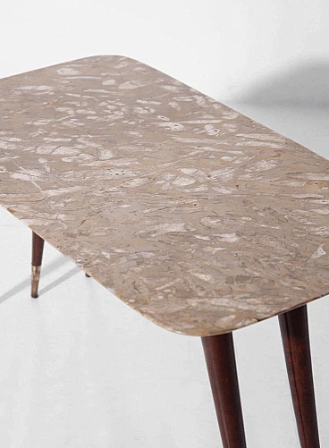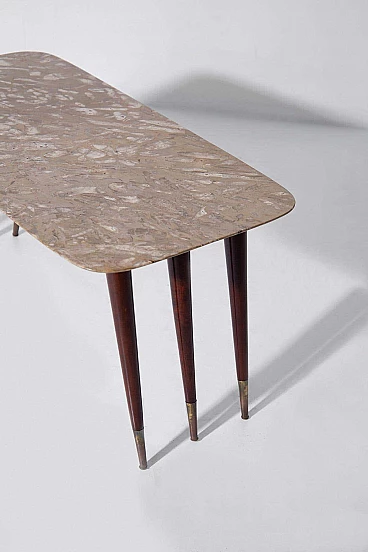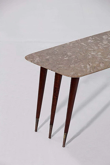 Entrate nel mondo del design italiano di metà secolo con un tavolino attribuito al leggendario Giuseppe Scapinelli, un vero capolavoro degli anni Cinquanta che coniuga senza sforzo forma e funzione. Questo tavolino non è un pezzo ordinario: si distingue per la sua forma insolita e rara, che lo rende una rappresentazione distintiva e iconica del design di metà secolo. Realizzato in legno, vanta una silhouette unica caratterizzata da tre gambe affusolate e coniche su ciascun lato, segno distintivo dell'estetica del design degli anni Cinquanta. Queste gambe non sono solo supporti funzionali, ma elementi scultorei che aggiungono interesse visivo e profondità al pezzo. Ai piedi di ogni gamba, fanno la loro comparsa ghiere in ottone che arricchiscono il tavolo con un tocco di lusso e raffinatezza. Questi piccoli ma significativi dettagli testimoniano la meticolosa lavorazione artigianale che ha portato alla creazione di quest'opera. Sopra la base in legno, il tavolino presenta uno splendido piano in marmo bianco grigio ornato da delicate venature beige. Questa scelta di marmo è una selezione rara e squisita, che eleva il tavolo a un livello di opulenza semplicemente ineguagliabile. La bellezza naturale del marmo e i suoi motivi unici creano un senso di eleganza senza tempo e di intrigo visivo. Le forme geometriche e le linee pulite e ben definite di questo tavolino contribuiscono al suo innegabile fascino. È un pezzo d'arredamento che trascende il tempo, integrandosi senza sforzo in un'ampia gamma di stili d'interni, dal moderno di metà secolo al contemporaneo. Il suo design minimalista ma di grande impatto testimonia il fascino duraturo dell'estetica italiana di metà secolo. Questo tavolino attribuito a Giuseppe Scapinelli è più di un semplice mobile: è un'opera che racchiude l'essenza del design italiano di metà secolo. Si rivolge a chi ha un profondo apprezzamento per l'artigianato, il lusso e l'innovazione. È una testimonianza dello spirito creativo di un'epoca che celebrava sia la forma che la funzione. Possedere questo tavolino è come possedere un pezzo di storia del design, un legame con l'eredità di un maestro del design e un invito a immergersi nella bellezza del design italiano della metà del secolo. È un tesoro che non solo valorizza il vostro spazio abitativo, ma funge anche da simbolo intramontabile di raffinatezza e stile. Per chi ama il design italiano di metà secolo, questo tavolino attribuito a Scapinelli è la perfetta incarnazione della passione e dell'apprezzamento per questa epoca iconica.